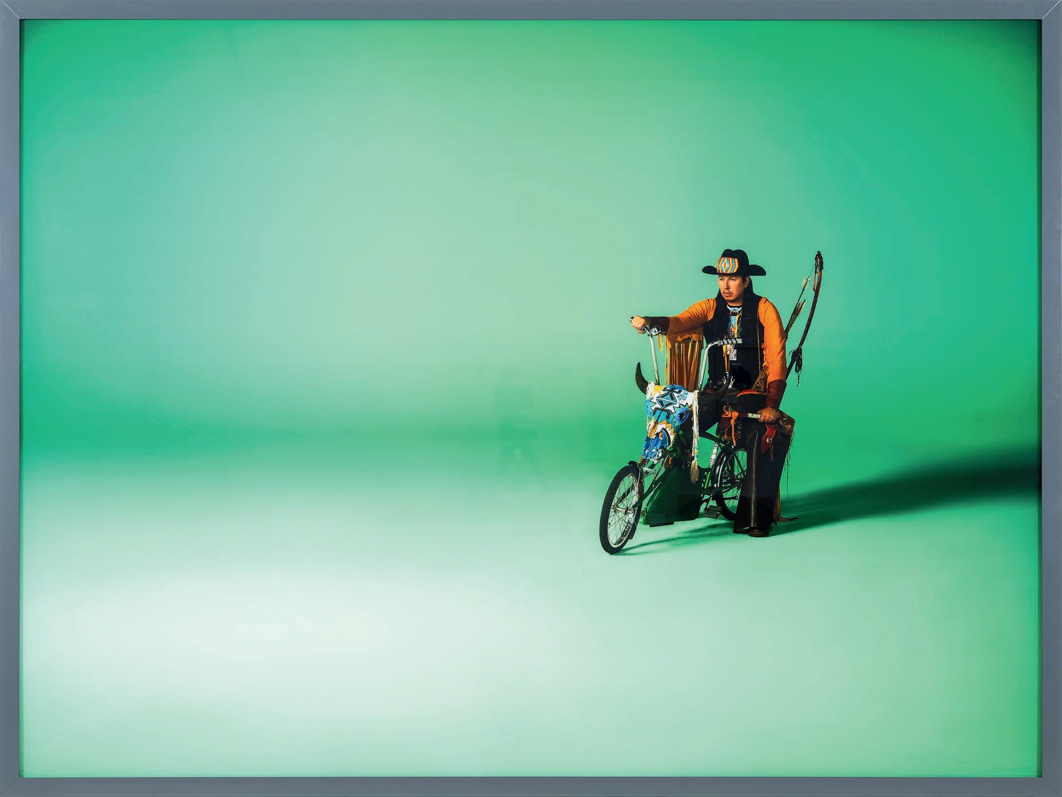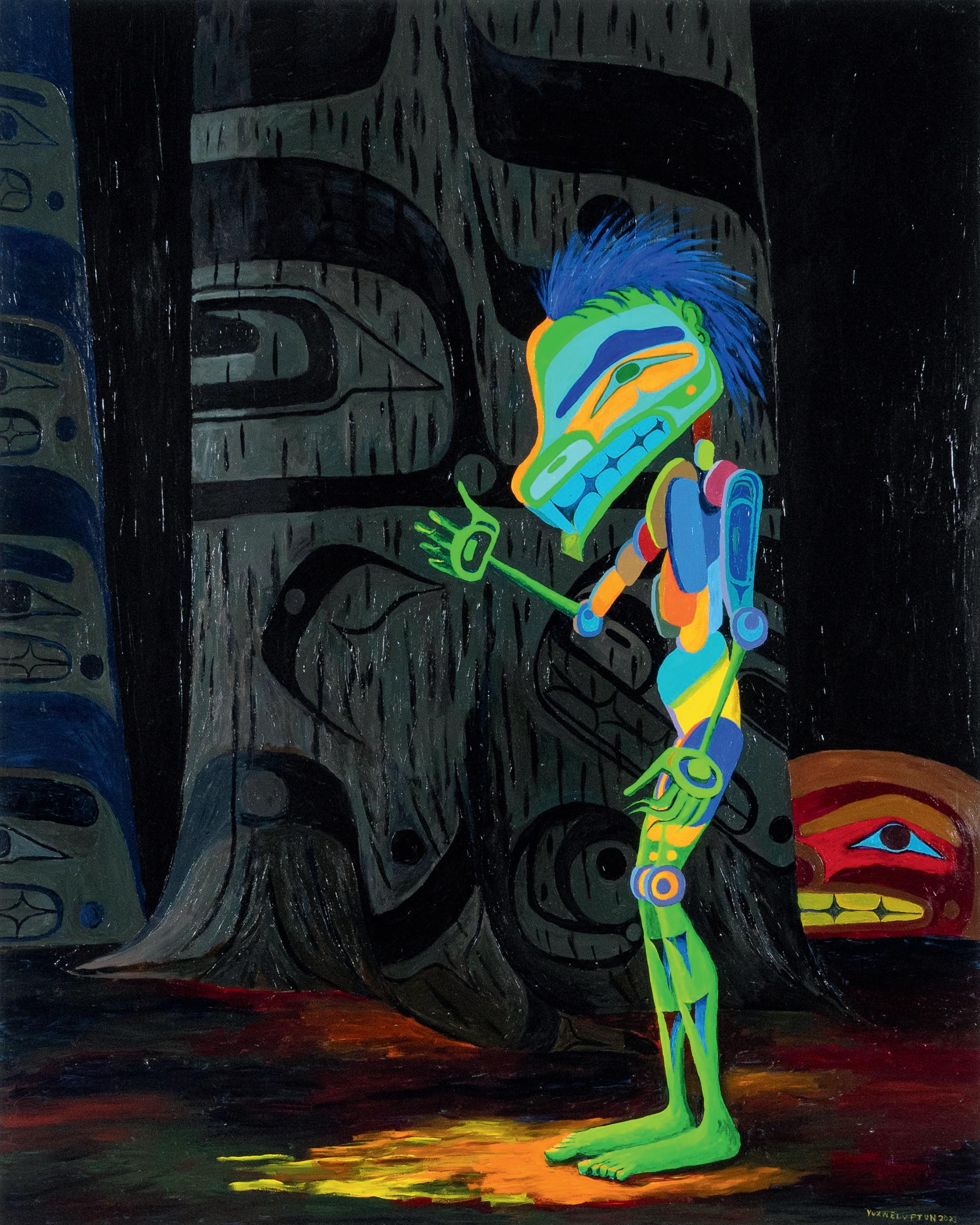 Yuxweluptun’s paintings have been featured in numerous ground-breaking exhibitions throughout North America and Europe at venues including the Tate Modern, Haus der Kulturen der Welt, Heard Museum, SITE Santa Fe, Montreal Museum of Fine Arts, and National Gallery of Canada. The Audain Art Museum’s Permanent Collection features two canvases by this renowned painter, entitled Clearcut to the Last Old Growth Tree and New Age Indian These works are indicative of Yuxweluptun’s extraordinary experiments with Indigenous traditions of formline design to communicate contemporary issues important to all Canadians. Man in the Woods, a 2023 work on canvas, features a classic Yuxweluptun depiction of an Indigenous male rendered in sinuous lines accented by brilliant colours set against a background that references both old-growth cedar trees and totem poles. Yuxweluptun remains one of the foremost painters of the past twenty-five years in Canada, and this piece would represent a significant addition to any private or corporate collection of note.