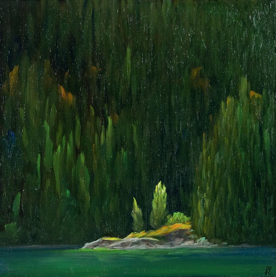Ross Penhall (1959 - ) is based in Vancouver and celebrated for his verdant landscape paintings that capture the interplay between natural and urban environments. He studied at Capilano College and Emily Carr College of Art + Design, focusing on studio art and printmaking under the mentorship of Wayne Eastcott. Penhall’s works are held in numerous private, corporate, and public collections across Canada and the United States. Light from Above was inspired by his coastal travels by boat north of Desolation Sound. This work highlights an outcropping of illuminated trees encircled by a dense forest made up of dark greens and deep blues. This small but mighty work echoes the feeling of grandeur while being amidst vast forests and would be a captivating addition to any home or office.