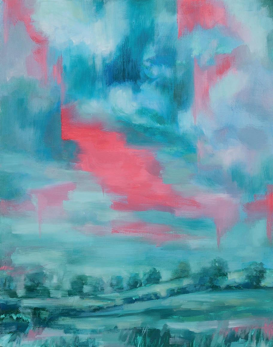 Lacey Jane Wilburn (1988 - ) is a Canadian contemporary painter and muralist known for expressive works that explore domestic space, portraiture, and narrative tension on canvas. She studied Fine Arts at MacEwan University, earned her BFA with great distinction from Concordia University with the opportunity to study abroad in Bordeaux, France, and completed her MFA at Emily Carr University of Art + Design. A Pastoral Glitch is a scene featuring farm land lit from the salmon-pink skies overhead, bathing the viewer in a feeling of reverie. Collectors value her work for its emotional depth, dynamic composition, and her masterful representation of light.
