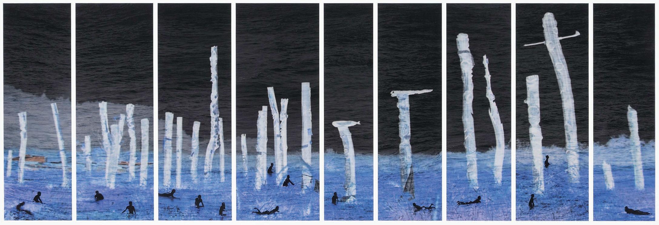 Yoon exhibited alongside Adad Hannah, Jake Kimble, and Michelle Sound in a 2024 group exhibition at the Audain Art Museum entitled Otherwise Disregarded, which was part of the Capture Photography Festival. Untitled 9 (Long Time So Long), 2022, an inkjet print, was among the works exhibited by this artist and was subsequently purchased for the Museum’s Permanent Collection. A figure dressed in white, seated on an embankment, wearing a traditional Korean mask, speaks to transplanted identities in Canada. The work on offer for the 2026 Audain Gala, entitled Still So (Mul Maeum), is comprised of nine scroll-like images depicting jangseungs (Korean totem poles). These poles were made by activists resisting the building of the world’s longest seawall in Saemangum, South Korea, which disrupted a major estuarine tidal flat, destroying the natural habitat for migratory birds. The first iteration of these environmental protest-loss images by Yoon was created in 2022 as nine hanging vertical works that have been reconfigured as a single image print edition specifically for this fundraiser. Thus, it represents a unique opportunity for a private or corporate collector to acquire an important work by Yoon that is uniquely connected to her installation-based production.