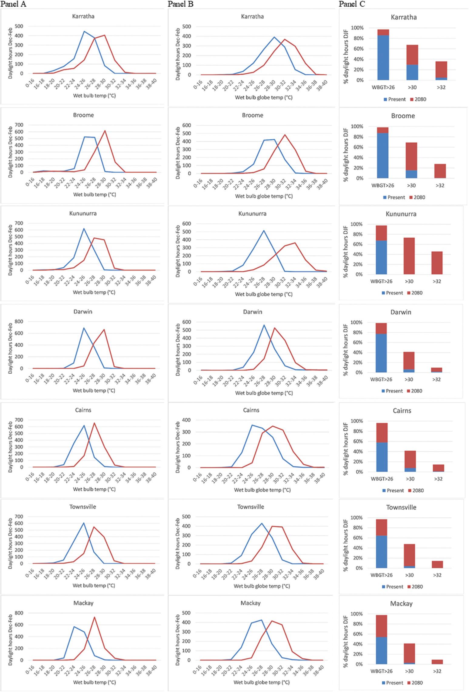 Figure 7. Panel A – Present and 2080 distribution of WBTs in the hours of 7am-7pm in the months December to February; Panel B – Present and 2080 distribution of WBGTs in the hours of 7am-7pm in the months December to February; and Panel C – Present and 2080 exceedance of threshold WBGT in the hours of 7am-7pm in the months December to February.