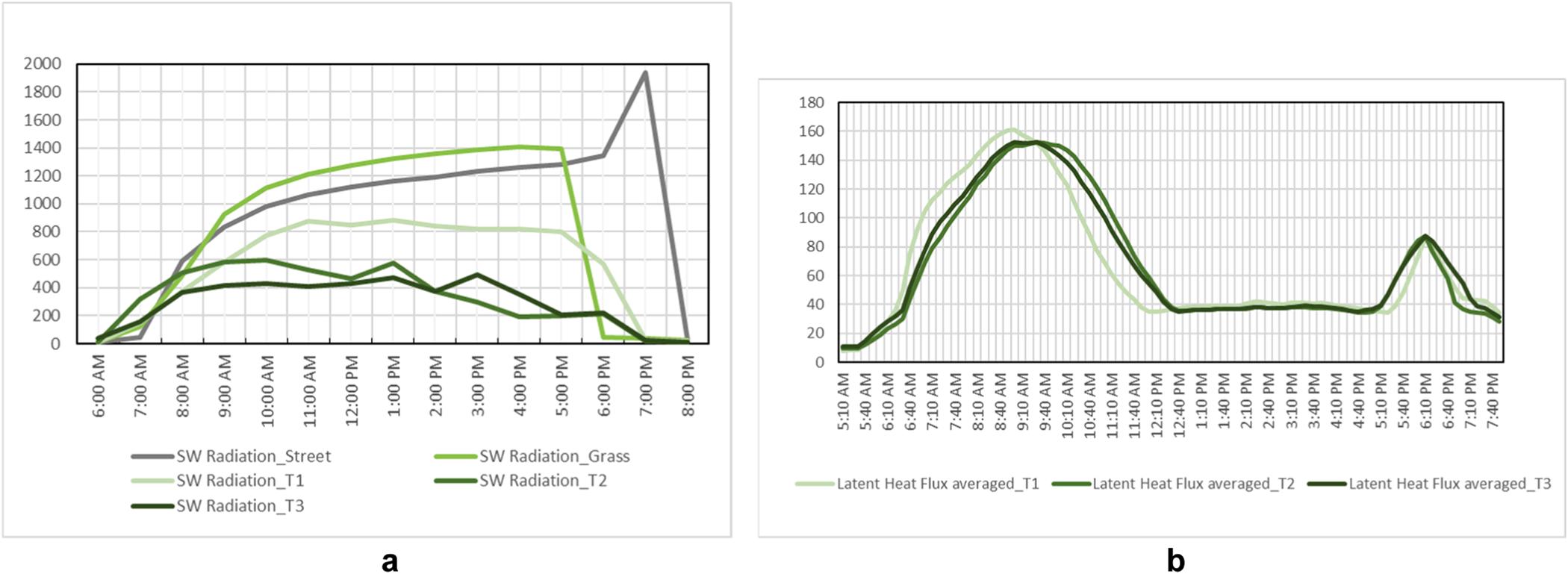 effect dissipates by midday (Fig. 8b). Open grass-covered areas only offer a thermal benefit over streets from 5 pm to 8 pm. Fig. 9 shows that the latent heat flux produced dissipates in accordance with transpiration by the trees and is less than the SWR received.