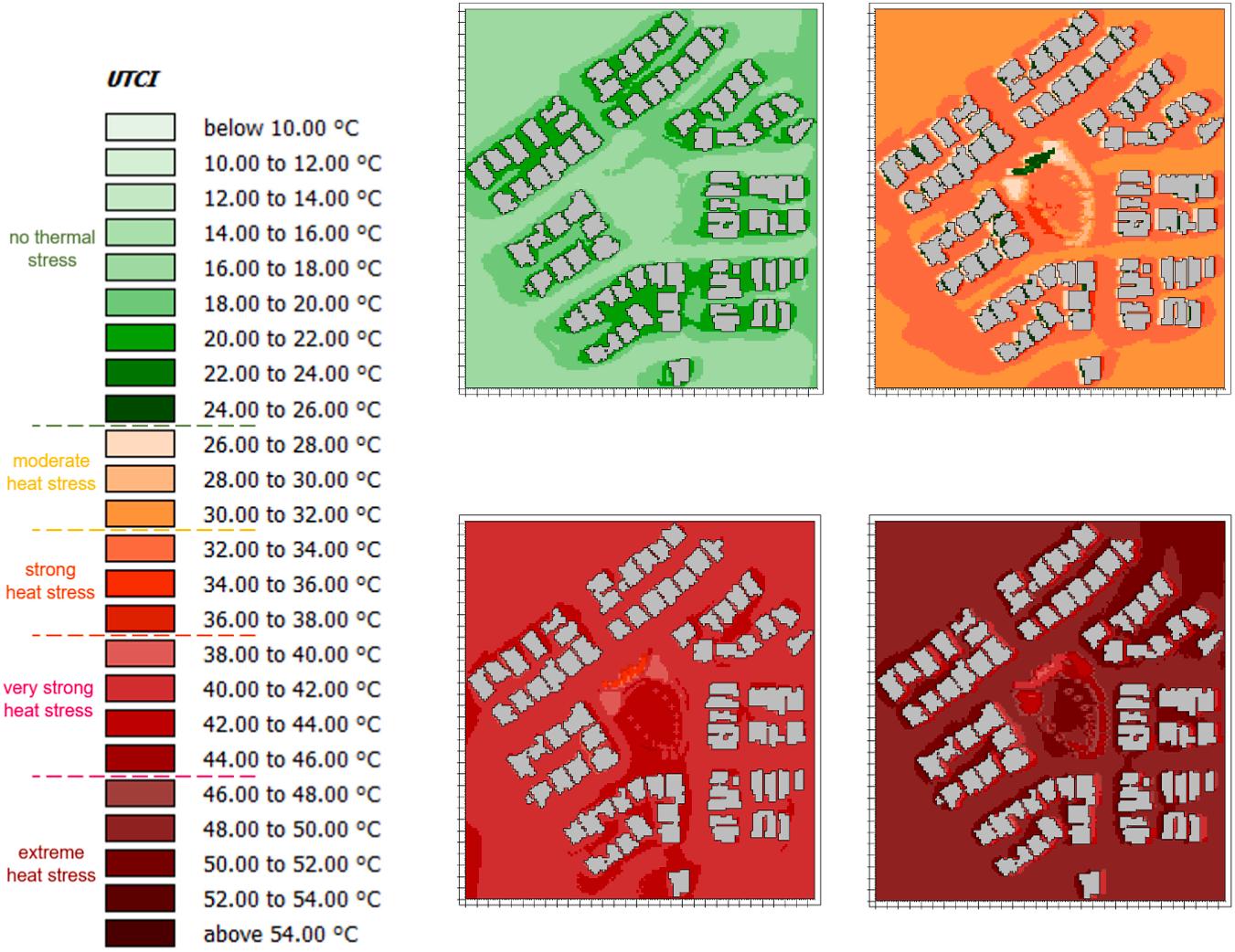 Comparison of UTCI, Present and Projected 2090, Average and Hottest Summer Days, 1.4 m Height.