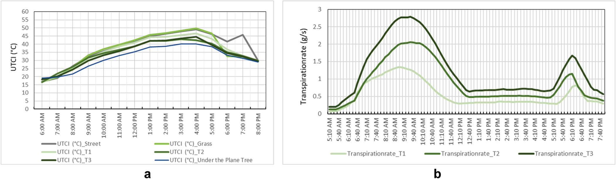 Fig. 6a compares UTCI values at 1.4 m height across six locations: street, open grassed areas, under 5.5 m (T1), 10.8 m (T2), and 14.5 m (T3) height trees (Fig. 3 a), and the cluster of Platanus x acerifolia trees. The results reveal 2.5–7.22◦ C cooling benefits under different trees compared to streets, attributed to shade and transpiration. Taller trees notably enhance thermal comfort, especially from 11 am to 6 pm, supported by higher transpiration rates (Fig. 6b). The Platanus x acerifolia cluster offers the most significant thermal comfort benefits.