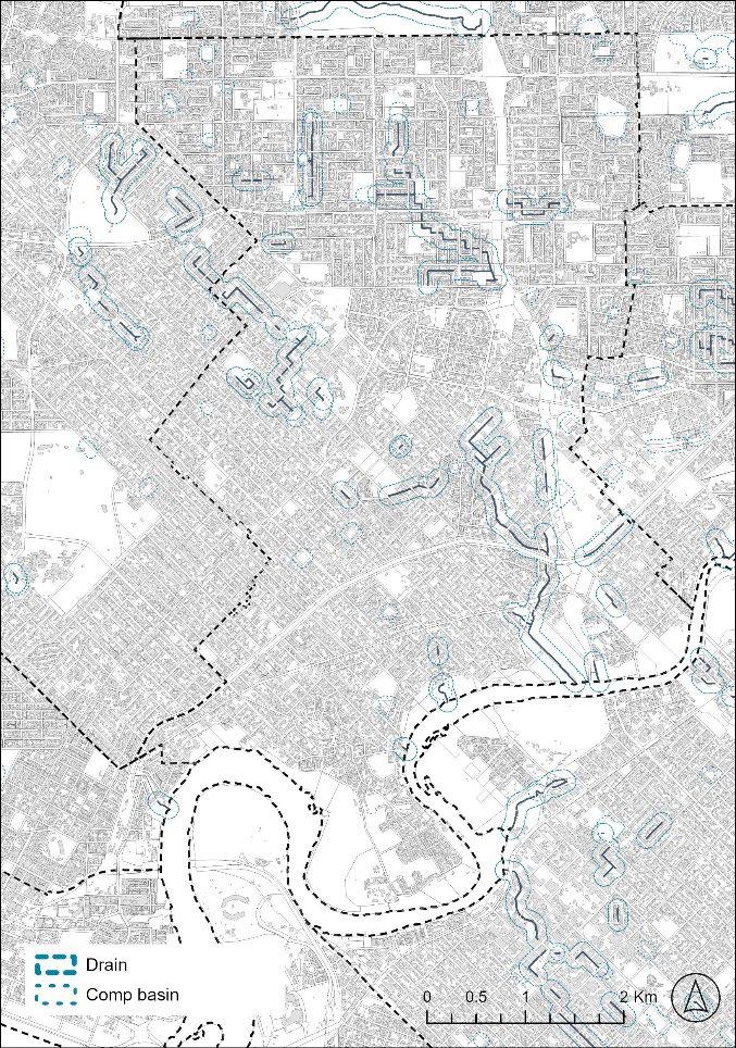 Perth is located within the Swan Coastal Plain, which features a complex network of rivers, estuaries, lakes, swamps, and geomorphic wetlands. Since European colonization commenced in the early 19th century, more than 200,000 hectares of wetlands have been drained for urban and agricultural development [33]. Due to the historic draining of hundreds of hectares of wetlands, Perth’s middle ring suburbs are dotted with drainage corridors and compensation basins (Figure 4). However, a preoccupation with drainage functions (providing flood control and conveyance) means that most of this drainage land delivers little in terms of liveability benefits to surrounding urban areas. Moreover, given the highly seasonal rainfall the hydrology of this drainage system is often ephemeral.