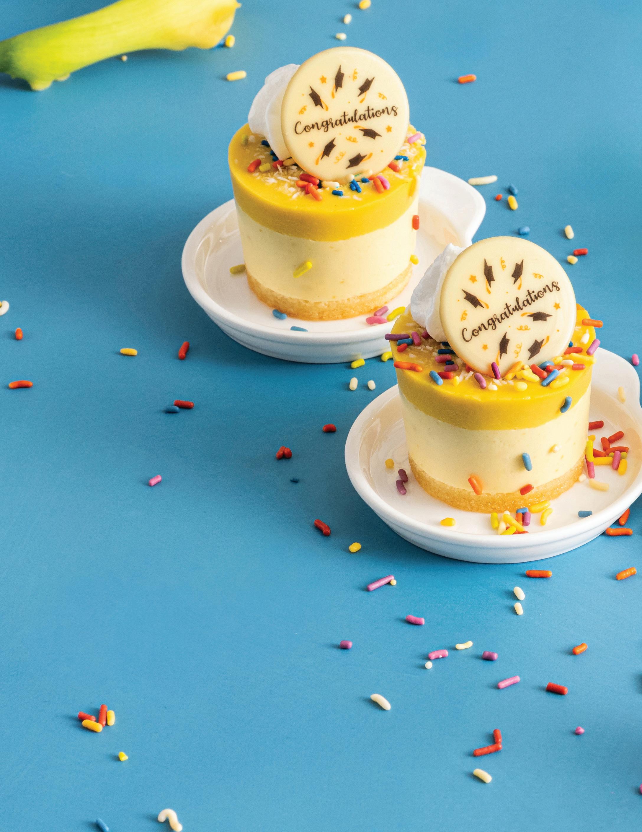 Commemorate graduation day with sprinkles and ease! IcEscape Vegan & Gluten-Free Tropical Petit Gâteau (760302) is the perfect base for PCB Creation graduation decor and ifigourmet All-Natural Rainbow Sprinkles (335001).