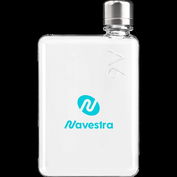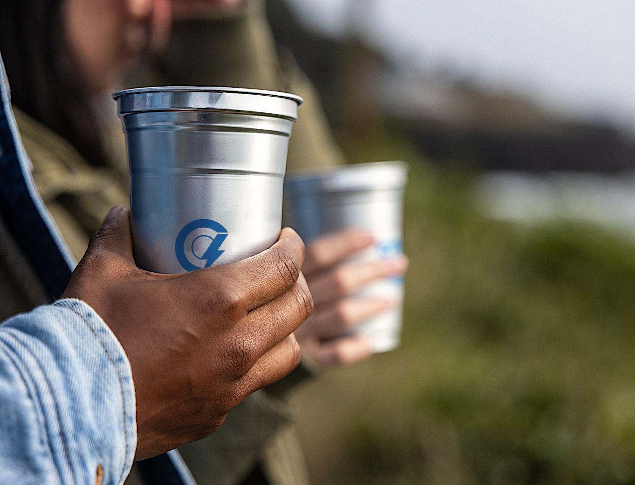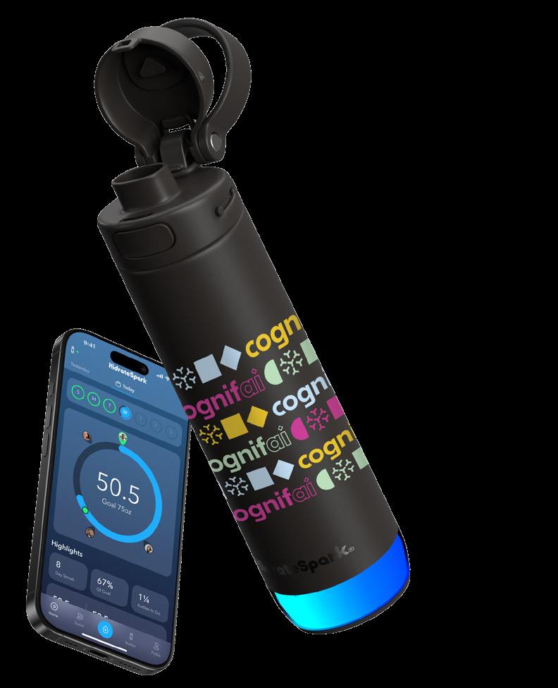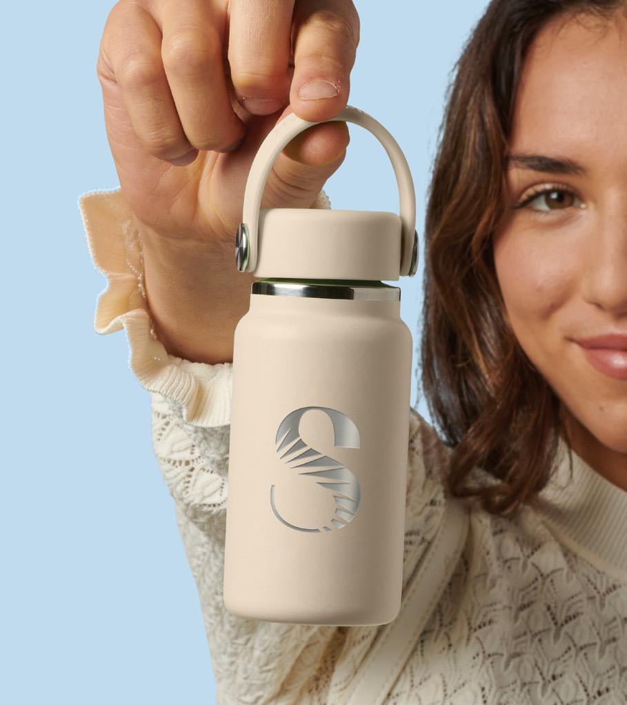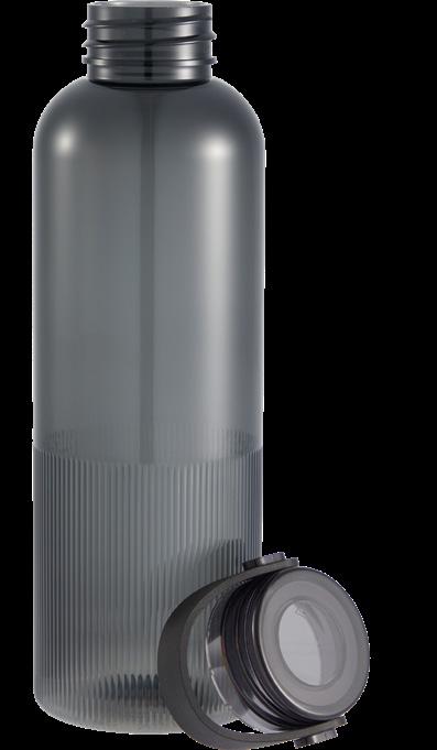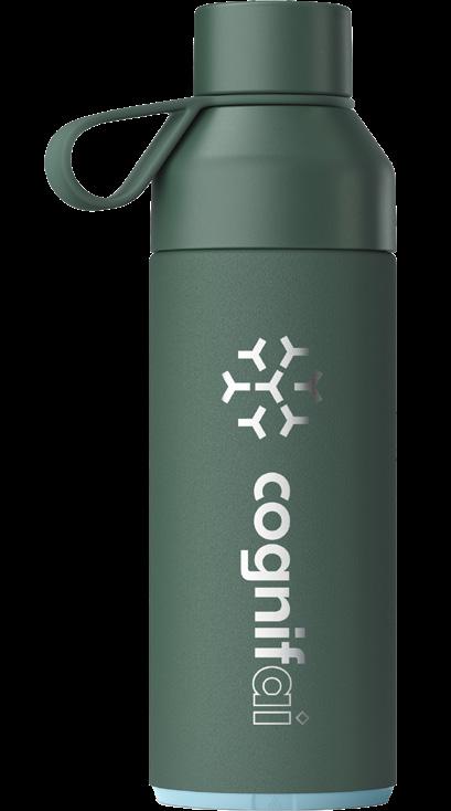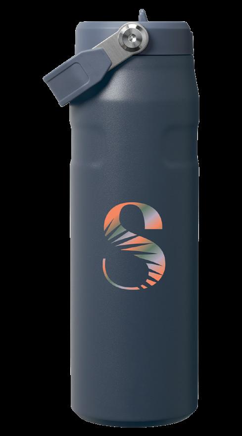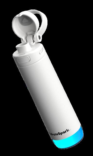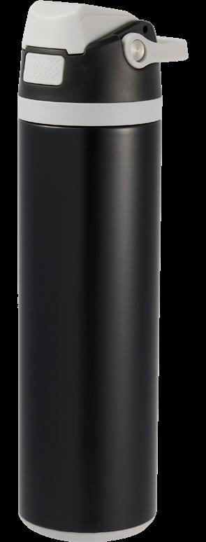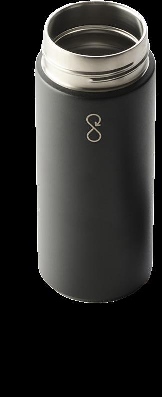 Double-wall insulated bottle with a dual-opening lid and an embedded NFC base plate that can be scanned to track refills.