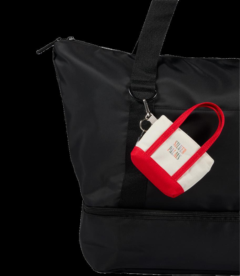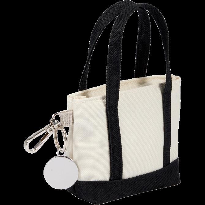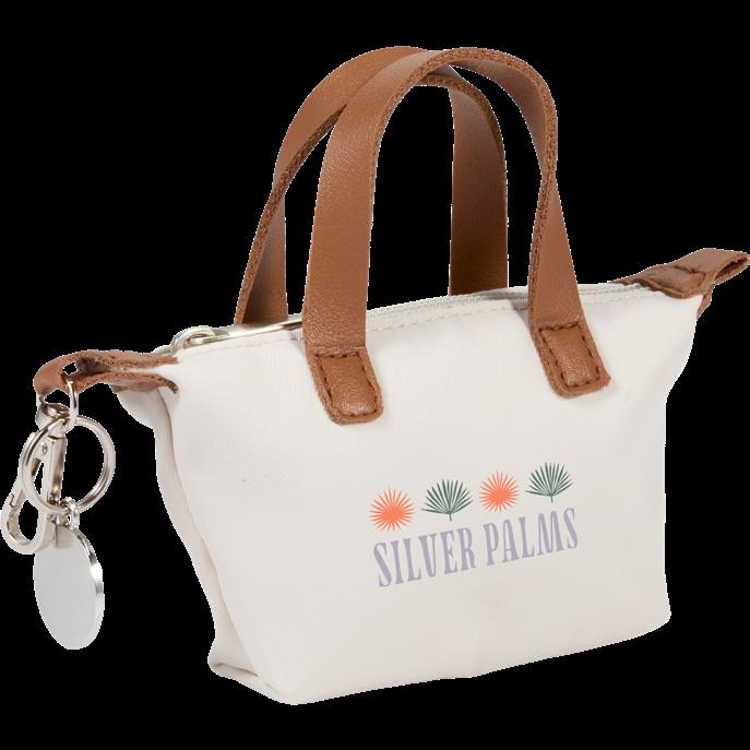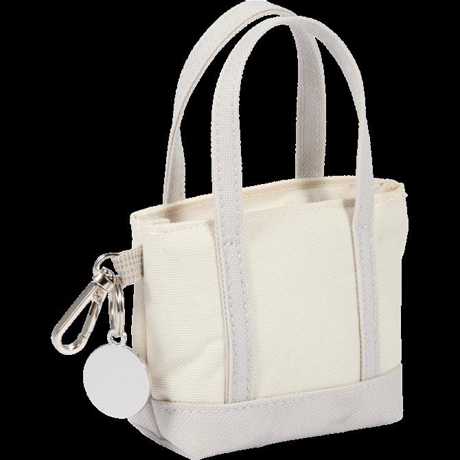 Mini shopper tote with short handles, zippered pocket, lobster clip, and silver charm.