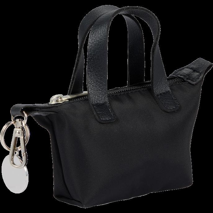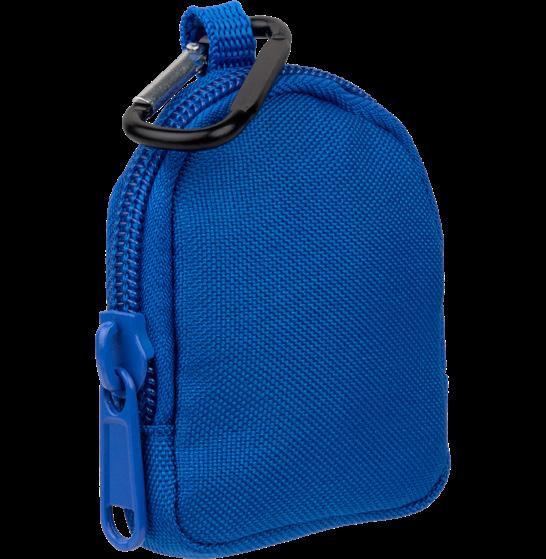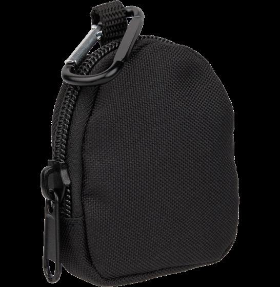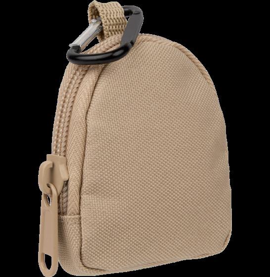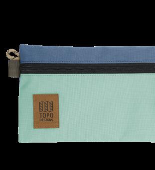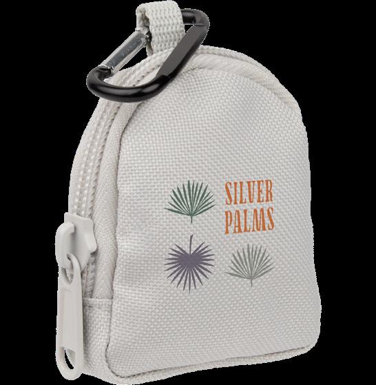 Zippered pouch with clip attachment, made from recycled materials.