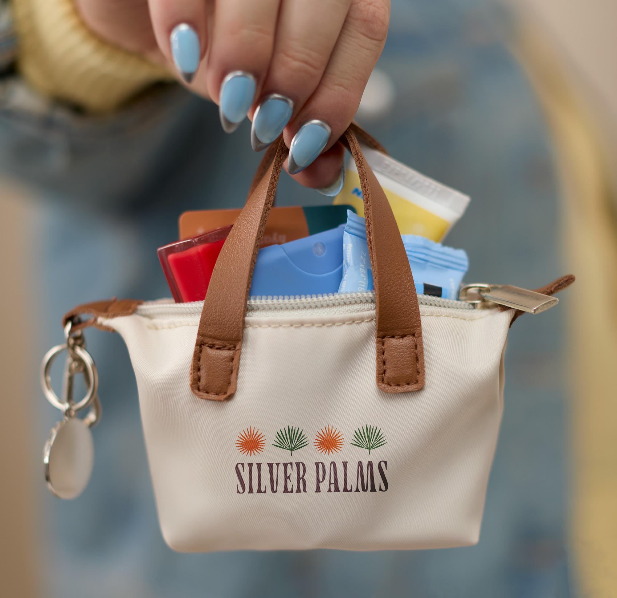 Mini luxury tote with tiny faux leather handles, zippered pocket, lobster clip, and silver charm.