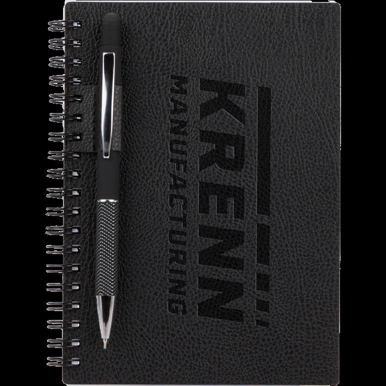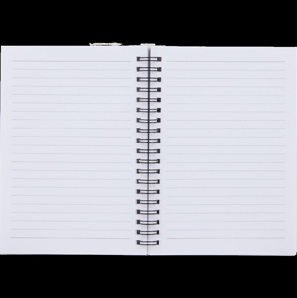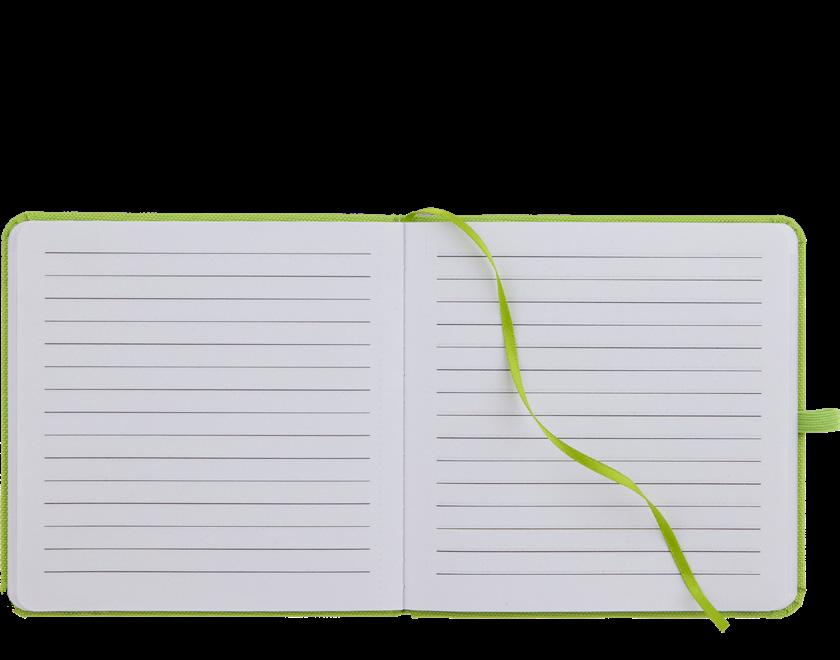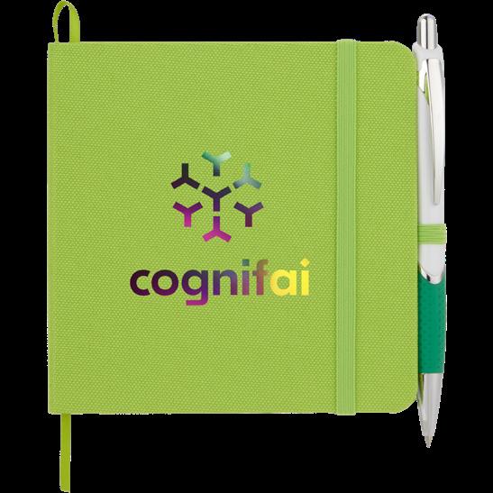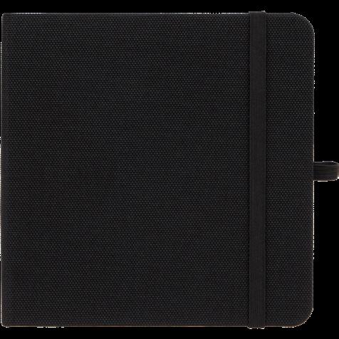 Pebble grain recycled PU cover, 72 sheets of FSC® recycled lined paper, and color-matching pen loop.