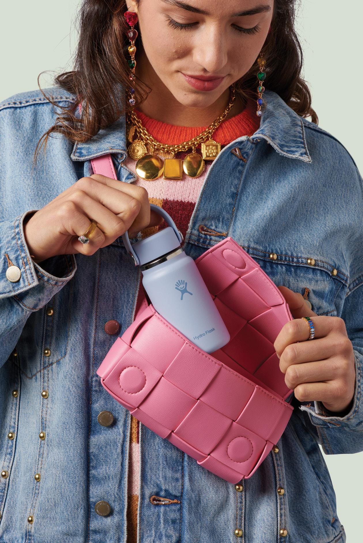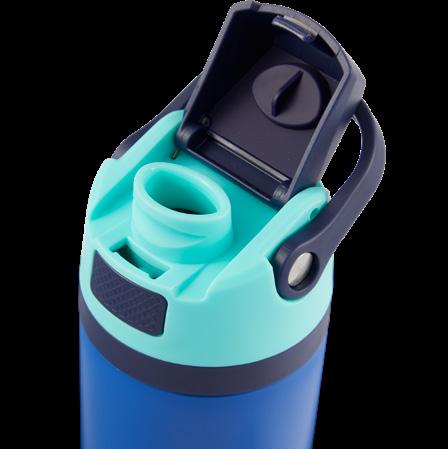 Spill-resistant, button-locked flip-top spout, double-wall vacuum insulation, and an integrated handle loop for easy carrying.