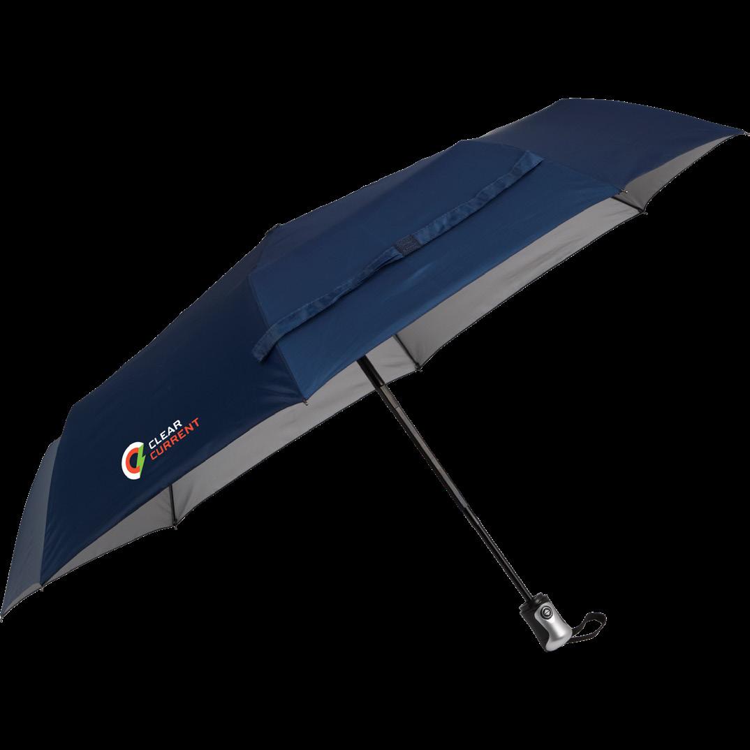 42” arc umbrella that folds to 11” for storage and opens and closes with the push of a button.