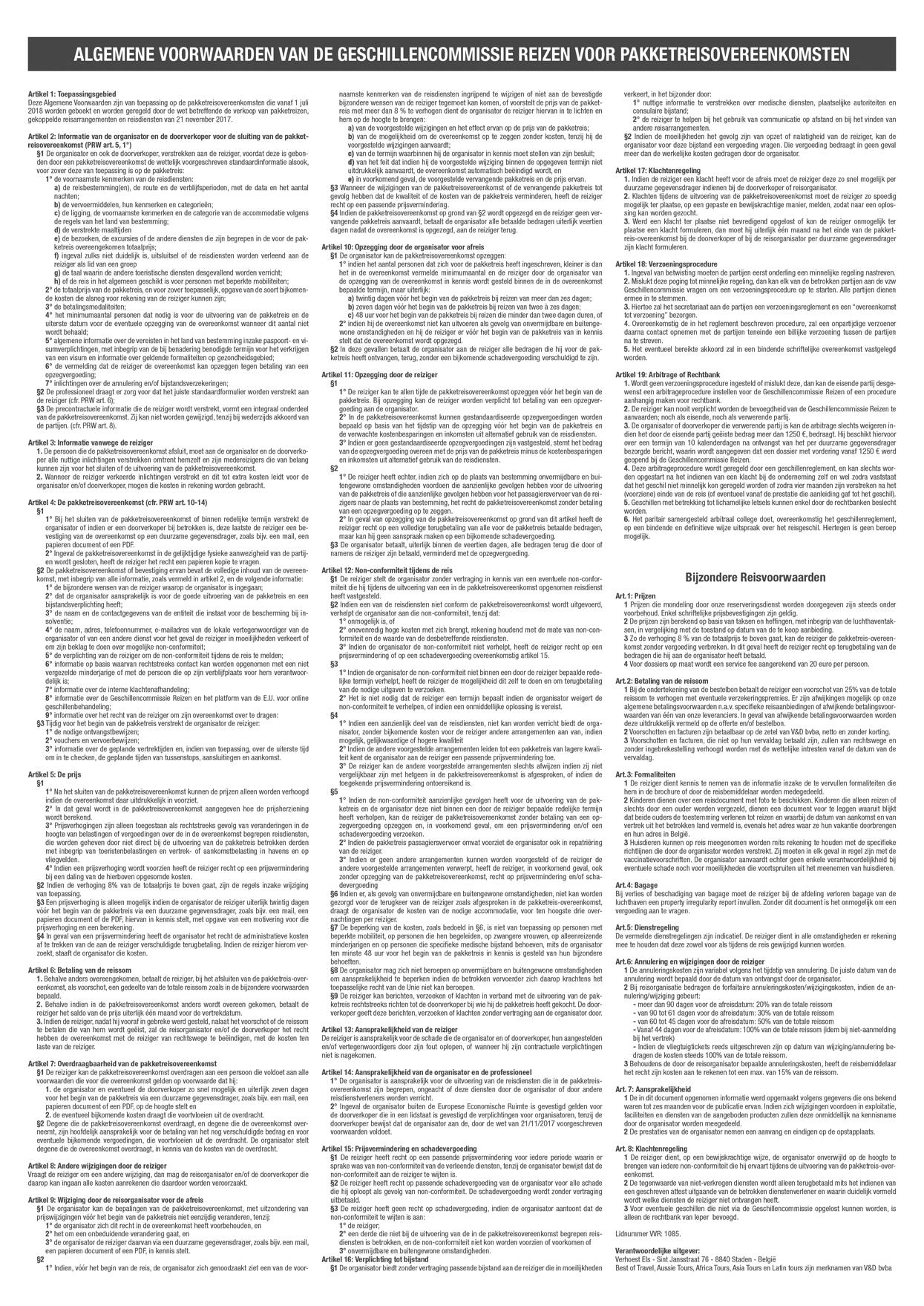 ONZE GARANTIES, JOUW ZEKERHEID. Uiteraard werken we met strikte garanties. Bij reservatie krijg je een prijswaarborg die je beschermt tegen plotse stijgingen van de muntwisselkoersen. We zijn verzekerd bij het ‘Garantiefonds Reizen’ en werken onder de zekerheid van de voorwaarden van de ‘Geschillencommissie Reizen’. Bij financieel onvermogen van de reisorganisator en/of reisbemiddelaar met wie je een reiscontract afsloot, kan je beroep doen op het Garantiefonds Reizen. Dit kan je doen door je te wenden tot jouw reisorganisator of reisbemiddelaar of door rechtstreeks contact op te nemen met het Garantiefonds Reizen. Dit laatste kan je als volgt bereiken: Metrologielaan 8, 1130 Brussel, fax +32-2/240.68.08, www.gfg.be of mail@gfg.be. Vraag de garantievoorwaarden aan jouw reisorganisator of reisbemiddelaar. Daarin vind je terug onder welke voorwaarden je, bij financieel onvermogen, terugbetaling kan vragen van de betaalde reissommen, of, wanneer de reis reeds een aanvang heeft genomen, de verderzetting van de reis of de repatriëring kan vragen. De prijzen van deze brochure zijn geldig tot en met het verschijnen van de brochure 2024 en ten laatste tot 31 maart 2024. Alle prijzen zijn voorbeeldprijzen. De prijzen kunnen veranderen door tussentijdse aanpassingen van onze leveranciers.