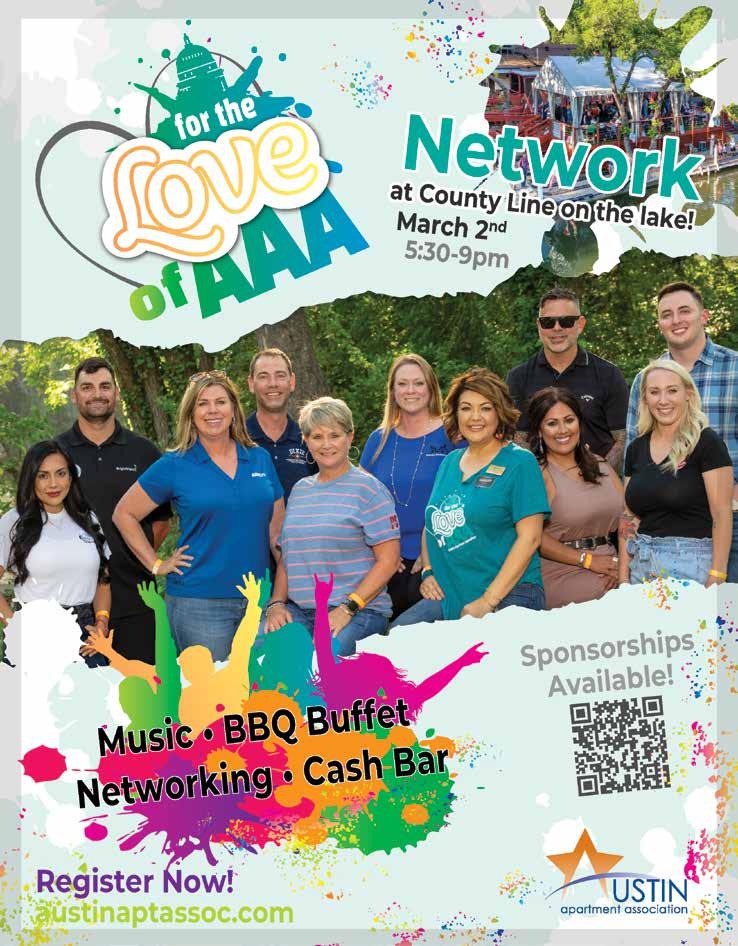 Austin Apartment Association 8620 Burnet Rd. #475 Austin, TX 78757 PRST STD U.S. Postage PAID Permit No. 3123 Austin, TX Be Seen Reserve Your Space Today 512.323.0900 hannah@austinaptassoc.com austinaptassoc.com/advertising