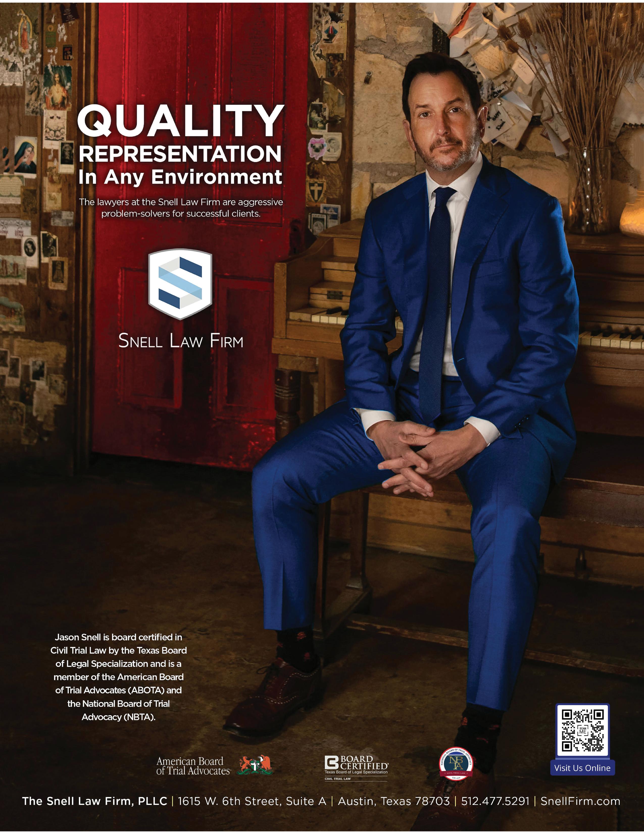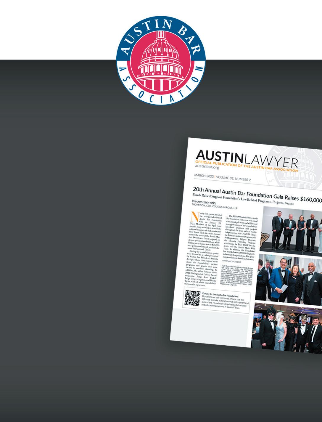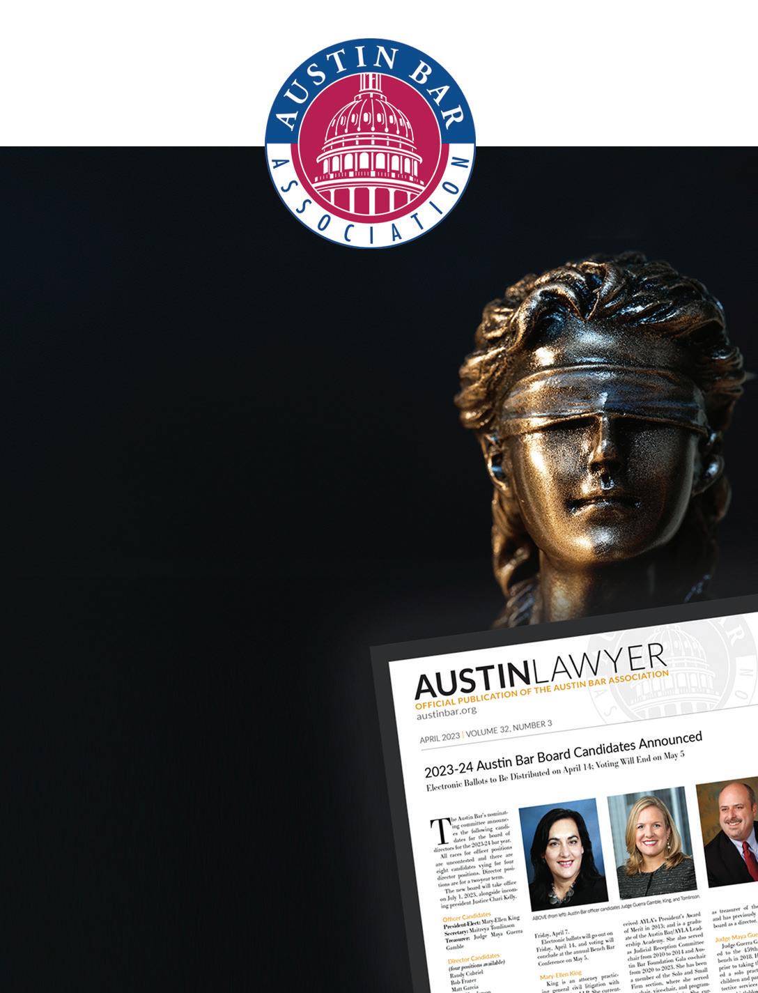 The views, opinions, and content expressed in this publication are those of the author(s) or advertiser(s) and do not necessarily reflect the views or opinions of the Austin Bar Association membership, Austin Bar Association board of directors, or Austin Bar Association staff. As a matter of policy, the Austin Bar Association does not endorse any products, services, or programs, and any advertisement in this publication should not be construed as such an endorsement.