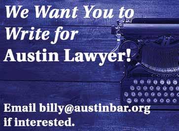 Contributions to Austin Lawyer are welcome, but the right is reserved to select and edit materials to be published. Please send all correspondence to the address listed above. For editorial guidelines, visit austinbar.org in the “About Us” tab.