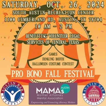 And after you get done at the Community Walk, join the Austin Bar and the Mother Attorney Mentoring Association (MAMAs) for the Pro Bono Fall Festival! This family-friendly event will have crafts, games, a dunk tank, and a Halloween costume contest. All proceeds from the festival will benefit Volunteer Legal Services of Central Texas. To register, visit austinbar. org. AL