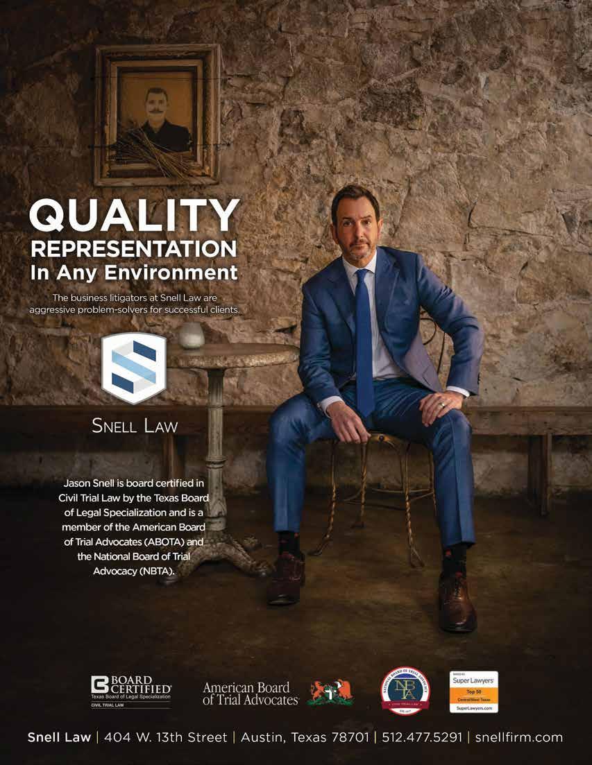 The views, opinions, and content expressed in this publication are those of the author(s) or advertiser(s) and do not necessarily reflect the views or opinions of the Austin Bar Association membership, Austin Bar Association board of directors, or Austin Bar Association staff. As a matter of policy, the Austin Bar Association does not endorse any products, services, or programs, and any advertisement in this publication should not be construed as such an endorsement.