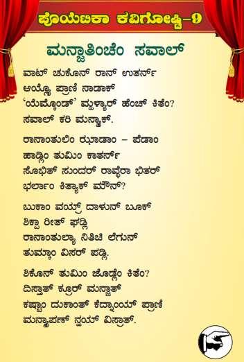 93 ವೀಜ್ಕೊಂಕಣಿ �������������� �������������� �������������� �������������� ಪ್ಗಾಯಂವಾಂತ್ಪಲಾ ಕವಂಕ್ ಏಕ್ಸಂತೊಸಾಚಿ ಖಬಾರ್... 1)ಮುಕಾಲಾ ಕವಗೊೀಷಿಠಂನಿ ಆಮ್ ಪಂಗಾಾಚ್ಯಏಕಾ ಪ್ಗಾಯಂವಾಂತ್ಪಲಾ ಕವಚ್ಯ ಕವತಕ್ ಕವಗೊೀಷಿಠಂತ್ಆವಾಾಸ್ ಆಸತಲೊ..! 2) ಆಮ್ ಪಂಗಾಾಂತಲ ಜಾಯೆತ ಕವ ಪ್ಗಾಯಂವಾಂತ್ ಆಸಾತ್. ತ್ಪಂಕಾಂ ಕವತ್ಪ ವಾಚಿ್ ಆಶ್ಯ ಆಸಾಲಾರೀಕವಗೊೀಷಿಠ ಆಸುಲ್ವಲಾ ತದ್ಘ್ಂ ತ್ಪಂಕಾರಜಾಮೆಳ್ತನಾ.ರಜೆರ್ ಆಯ್ಲಲ್ವಲಾ ತದ್ಘ್ಂ ನಾನಾಂತ್ಪಾ ಕಾರಣ್ಟಂನಿ ಕವಗೊೀಷಿಠಕ್ ಹಾಜಾರ್ ಜಾಂವ್ಾ ಸಂದ್ಘರಪ್ಮೆಳ್ತನಾ.ಅಸಲ್ವಾ ಕವಂಕ್ ಏಕ್ಆವಾಾಸ್ ದಿಂವಾ್ಕ್ ಹಾಂವ್ಂ ಏಕ್ ಯೆವಿಣ್ ಕೆಲ್ವಾ ... 3) ಪ್ಗಾಯಂವಾಂತ್ಪಲಾ ಕವಂನಿತಮೆ್ಂ ಏಕ್ ವಂಚ್ಯಣರ್ ಕವತ್ಪ ಮಕಾ ಧ್ತಡ್್ಂ.ವಂಚುನ್ ಆಯ್ಲಲ್ಲಂ ಏಕ್ ಕವತ್ಪ ಆಮ ಏಕಾ ಬಯಾಯ ವಾಚಕಾ ಕನಾಯಕವಗೊೀಷಿಠಂತ್ ವಾಚಯೆತಲ್ವಾಂವ್. ಹಯೆಯಕಾ ಕವಗೊೀಷಿಠಂತ್ ಏಕಾ ಕವತಕ್ ಆವಾಾಸ್ ಆಸತಲೊ. ದೇವ್ಬರೆಂ ಕರುಂ ...ನವೀನ್ ಪಿರೇರ,ಸುರತಾರ್. �������������� �������������� �������������� ��������������
