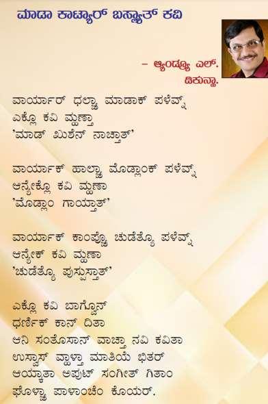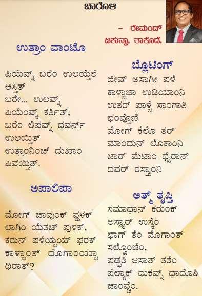 4 ವೀಜ್ ಕ ೊೆಂಕಣಿ ಹ್ಯಾ ಎಕ್ಲ ಆಯನ್್ ವೆಳಾರ್ ಕೊಾಂಕಿಣಚೊ ಭಾಾಂದ್ ವಿಸಾ್ರವ್ನ್ ಮಂಗುಳರಮ್ನಿಸ್ಗೊಾಂಯ್ರಜ್ಯಾಂತ್ ತ್ಲ್ ತಾಾಂಚೊಚ ಜ್ಯತಾ. ತೆೆೊ ತಾಳೊ, ಲ್ಲಕ್ಲಕ್ಚ ಪ್ರವಂವಿಚ ರೀತ್, ಉಚ್ಲ್ಾರ್, ಕ್ಲಳಾಾ ಮ್ನಾಾಂ ಕದೊಳಾಾಂವೆಚ ದೆಣಾಂ ಘೆವ್ನ್ ಕೊಾಂಕಿಣ ಸಂರ್ಗೀತಾಾಂತ್ ನ್ವೆಾಂಸಾಾಂವಾಚೆಾಂವಾಹರಾಂವಾಳೊಾಂವ್ನ್ ಉದೆಲ್ಲೆ ಮಾನಾಯ್ ಜೆರೊಮ್ ಡ್ಸೊೀಜ್ಯ. ಕೊಾಂಕಿಣಾಂತ್ ಥೊಡ್ಾಂ ಪದಾಂ ಫಲಿಮೀ ತಾಳಾಾನ್ ಲ್ಲೀಕ್ಚ ಕ್ಲಯ್ತವಾಂನಿ ಗಾಾಂವಾಚಾ ರ್ಗಾ್ ಏಕ್ಚ ಹಜ್ಯರ್ ನ್ಶವದ್ ಆನಿ ಸಾಟ್ ಇಸೆೊಚ್ಲ್ಾ ಆಸ್ ಪ್ರಸ್ ಕ್ಲಳಾರ್ ಆಪ್ೆ ಸೊಾಂತ್ ತಾಳೆ ಘೆವ್ನ್ , ಪದಾಂ ಗಾವ್ನ್, ನ್ವೆಾಂಸಾಾಂವ್ನ ಆನಿ ವಿಭನ್್ ಕೊಾಂಕಿಣ ಸಂರ್ಗೀತ್ ಕೊಾಂಕಿಣ ಸಮಾಜೆಕ್ಚ ದಿಲ್ಲೆ ಮ್ಹ್ಯನ್ ಕಲಾಕರ್ ಜೆರೊಮ್ ಡ್ಸೊಜ್ಯ. ಹ್ಯಾ ಬದೆರ್ಣಕ್ಚ ಲ್ಲೀಕ್ಚ ಸವಾ್ಸಾಯ್ಲನ್ ವರವ್ನ್ ಪಳೆವ್ನ್ ಸಹಕ್ಲರ್ ದಿೀಲಾಗೊೆ. ಹ್ಯಾ ಉಪ್ರಾಾಂತ್ ಕೊಾಂಕಣ ಕೊಗುಳ್ ಶಿಾೀ ವಿಲಿಿ ರಬ್ರಾಂಬಸಾನ್ ಆಸಲಿಚಚ ಪಾಕಿಾಯ್ತ ಜ್ಯಾರ ದರ್ಲಿವ. ಸವೆವರ್ ಹಾಂದಿ