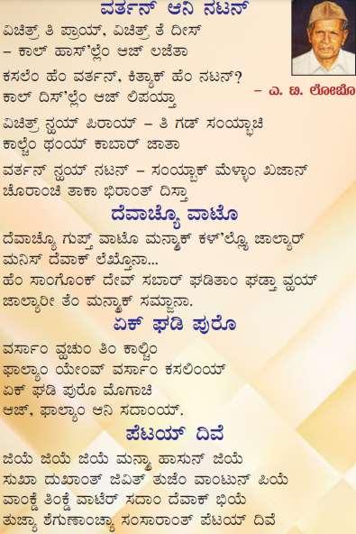 18 ವೀಜ್ ಕ ೊೆಂಕಣಿ ಯೊಂವ್ಚ್ ಅೊಂಕ... ಕೊಂಕಣ್ ಕಗುಳ್ ಶ್ರೀ ವಲ್ಫಿ ರೆಬೊಂಬಸಾಕ್ ಸಮಪಿಾಲ್ಲೊ ಅೊಂಕ. 2010 ಮಾಚ್ಚಾ 9 ವೆರ್ ದೆವಾದಿನ್ ಕೊಂಕಣ್ ಕಗುಳ್ ಶ್ರೀ ವಲ್ಫಿ ರೆಬೊಂಬಸ್, ಆಜ್ "ಗ್ಡಯನ್ ಕರಿ, ನಿರಂತರಿ, ಕರಸಾಾ ಸಮೊರಿ". ಎಪಿರಲ್ದೀನ್- ವೆರ್81ವ್ಚಜರ್ಲ್ಾದಿೀಸ್ತೊಂಚೊ.