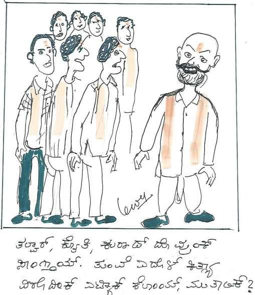 84 ವೀಜ್ ಕ ೊೆಂಕಣಿ ವೇಳ್ ರವ್ನ, ಹ್ಯಾಂವ್ನ ಎಕೊೆಾಂಚತಾಾ ಕಲೆೀಗವಾಯಕ್ಚಯ ಕರಯಪ್ರಪಕ್ಚಯ ಮೆಳುನ್ಯ್ಲತಾಾಂ, ಆಮಾಚಾ ಜ್ಯತಕ್ಚಚ ವಾಯ್ಾ ನಾಾಂವ್ನ ಹ್ಯಡೆೆಾಂ ತಾರ್ಣ” ಮ್ಹಣತ್್ ಉಟೊೆ. ವಾಟೆರ್ ವೆತಾನಾ ಚೆನ್್ಪ್ರಪಚ್ಲ್ಾ ಘರ ಜುಾಂತ್ ಮಗುದನ್ ತೆ ಮಕ್ಲಿ ಪ್ಾಂಟೆ ತೆವಿೊಾಂಸುಟ್ಲೆ ಚೆನ್್ಪಪ , ಉಗಾಪ್ರಪಯ ತಾಾಂಚೆ ಸವೆಾಂ ಆಸ್ಲೆ. ಪಯೊಲಾಾನ್ಾಂಚ ಕರಯಪ್ರಪಕ್ಚ ಸ್ಥದದಪ್ರಪಚ ರ್ಳಕ್ಚ ಮೆಳಿಳ. ತ್ಲ್ ಕಲೆೀಗವಾಯಲಾರ್ಗಾಂ “ಪಳಯ್ಲೆಾಂಯ್ರ್ಗ? ಬಾಂಗುಳರಥಾವ್ನ್ ಆಯಲಾೆಾ ದಗಾಾಂ ಪಯ್ ಹೊಸ್ಥದದಪ್ರಪಯಎಕೊೆ ಮ್ಹಣ ದಿಸಾ್. ಆನೆಾಕೊೆ ಕೊೀಣರ್ಗ? ಪರಟ್ ಇಸೊ್ಲ್ನ ಇನ್್ ಪ್ಕಾರ್ ಜ್ಯಲಾಾರ ಘಟ್ಾ ಆಸಾನ್ಹಾಂಯ್ರ್ಗ?” ಮ್ಹಣಲ್ಲ. “ತ್ಲ್ ಕೊಣಗೆರ್ ಆಯಲ್ಲೆರ್ಗ? ತಾಾಂಗೆರ್ ಕೊೀಣ ಆಯಲ್ಲೆರ್ಗ ತುಾಂ ಆಮೊ್ರನ್ ಎಕ್ಲಕ್ಚ ಏಕ್ಚ ಗಾಾಂಟ್ ಘಾಲಾ್ಯ್.ತರಹ್ಯಾ ವೆಳಾರ್ಚಹ್ಯಣ ಜನಾರನಾಪುರಾಂತ್ ಆಸೆಚಾಂ ವಿಜಿಮತಾ್ಯ್ಲಚೆಾಂಚಸಯ್”. ಸ್ಥದದಪಪ ಪಯೊಲಾಾನ್ಾಂಚ ಹ್ಯಾಂಕ್ಲಾಂ ಪಳವ್ನ್ ‘ಬರಾಂಚ ಜ್ಯಲಾಂ ಹ್ಯಾಂಗಾಸರ್ಚಮೆಳೆಳ’ಮ್ಹಣಚಾಂತುನ್ ತಶಾಂಚತಾಾಂಕ್ಲಾಂಲಾರ್ಗಾಂಪ್ರವೆ. “ಕಿತೆಾಂ ಸ್ಥದದಪಪ ಭ್ಲಾಯ್ರ್ಗ? ಆಪೂಾಪ್ ಜನಾರನಾಪುರಕ್ಚ ಪ್ರವೆಯ್” ವಿಚ್ಲ್ರೆಾಂ ಕಲೆೀಗವಾಯನ್. “ಕ್ಲಮ್ ಆಸ್ಲೆಾಂ ಆಯೊೆಾಂ, ತುಮಾಂಯ್ ಹ್ಯಾಂಗಾಚ ಆಸ್ಥಚ ಖಬರ್ ಮೆಳಿಳ. ತಶಾಂ ತುಮಾ್ಾಂ ಮೆಳುಾಂಕ್ಚ ಭಾಯ್ಾ ಸರ್್ ಆಯೊೆಾಂ”ಮ್ಹಣಲ್ಲಸ್ಥದಯಪಪ. “ಖಂಯ್ರವಾೆಯ್ರ್ಗ?” “ಇನ್್ ಪ್ಕಾರ್ ರಂಗಣಣ ಘರ, ತ್ಲ್ ಮಾಹಕ್ಲಜ್ಯಯ್ಜ್ಯಲ್ಲೆ , ರ್ಳಿ್ಚೊ”. ಕಲೆೀಗವಾಯಕ್ಚಯ, ಕರಯಪ್ರಪಕ್ಚಯ ಭುಾಂಯ್ ತ್ಲ್ಾಂಡ್ ಸೊಡ್್ ರ್ಗಳಾ್ಶಾಂ ಜ್ಯಲಾಂ. ಆಮಾಚಾ ಪ್ರಡೆ್ ವಿರೊೀದ್ ಸ್ಥದದಪಪ , ನಾಾಯ್ವಿಧಾಯಕ್ಚ ಸಭೆಚೊ ಸಾಾಂದ ಸ್ಥದದಪಪ , ದಗಾಾಂಯಚಾಂ ತ್ಲ್ಾಂಡ್ಟಾಂ ಬವಿೆಾಂ “ಯ್ಲ ಯ್ಲ ವಾಟೆರ್ ಕಿತೆಾಂ ಉಲ್ಲವೆಣಾಂ ಚೆನ್್ಪಪಗೆರ್ ಯ್ತಾಂ ಥಂಯ್ಚಜೆವಿೊ ಕಂಯ್”. “ನಾಾಂ ನಾಾಂ ಜೆವಾಣಕ್ಚ ಹ್ಯಾಂವ್ನ ಇನ್್ ಪ್ಕಾರಗೆರ್ ವೆತಾಾಂ. ಅರ್ಲಹಳೆಳಚೊ ಗವಾಯ , ರಂಗನಾಥಪುರಚೊ ಗವಾಯ ಸಕ್ಡ್ ಥಂಯ್ರ್ಆಸಾತ್”. “ಹೊ ಹೊ ತುಮ ಸಕ್ಡ್ ಗೊಾಂವಾಯಾಾಂಚೆ ಮಕ್ಲಿ. ಗೊಾಂವಾಯಾ ಮಾಸೆ್ರಕ್ಚ ಸಸೆಪಾಂಡ್ ಕರ್್ ತಾಾ ಇನ್್ ಪ್ಕಾರಗೆರ್ಫೆಸ್್ ಮಾರ್್ಆಸಾತ್ ದಿಸಾ್”. “ಕಲೆೀಗವಾಯ ತುಕ್ಲ ಜ್ಯತ್ಕ್ಲತಚ್ಲ್ಾ ಚಾಂತಾಪ ಶಿವಾಯ್ ಬರಾಂ ಕ್ಲಾಂಯ್ ದಿಸಾನಾ ಕಿತಾಾ ? ರೇಾಂಜ್ಯಾಂತ್ ಶಾಂಬರಾಂನಿ ಗೊಾಂವಾಯಾಾಂಚೆ ಮಾಸೆ್ರ್ ಆಸಾತ್.ಕಿತಾೆಾಾಂಕ್ಚಸಸೆಪಾಂಡ್ಜ್ಯಲಾಾಂ?