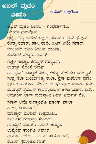 69 ವೀಜ್ ಕ ೊಂಕಣಿ ಮಾ ಜ್ಯಾ ಪಾಥಮ್ ಕವಿತ್ರ... ಆಯೊಂ ಸಡ್್ ಹಂವ್ನಮಂಗಳರ್ ಪಾವ್ಚೊಂ ಯೆೀವ್ನ್ ಹಂವ್ನ ಬೆಂಗಳರ್ ಪಳ್ಕಲ್ಫಹಂವಂ ತಿಚಿ ಸಭಾಯ್ ಜಾಲ್ಫ ಮಾಾಕಾ ತಿಚಿವಿರಾರಾಯ್ ಪಳ್ಕೆ್ಲಂ ಸಗ್ಡ್ಾಂನಿ ಕಾಂಕ್ಣಾೀಟ್ ಮಾಲ್ಫಯಹಂವಂ ಕ್ಣಂಕಾಾಟ್ ಪಳಲ ಹಂವಂ ಸಬಾರ್ಮಾರೊಗ್ ಹಂಗ್ಡ ಸಕಕಡ್ಯ್ ಮಾಾರೊಗ್ -------------------------------------------ದರ್ನ್ರಚೆೊಂ ಆದ್ಯಂವ್ನ ಎವಕ್ ದವಲಯಂ ತ್ರಂಕಾಂ ತ್ರಚ್ಯಾ ಸ್ತವಕ್ ತಿಂ ಚಲ್ಫಯಂ ಆಪಾೊಾ ರ್ಟೆಕ್ ಪಡಿೊಂ ತಿಂ ತ್ರಚ್ಯಾ ತ್ರಳ್ಕಿಂಕ್ ಸಮಪ್ರಯಲಂ ತ್ರಣಿಂ ಸ್ತೈತ್ರನ್ಹಕ್ ವ್ಚಡ್ೊಂ ತ್ರಣಂ ಆಪಾೊಾ ಸ್ತವಕ್ ಆರ್ಕಲ್ಯತ್ರಣಿಂ ದರ್ಚೊ ಆರ್ಜ್ ಜಾಲ್ಫತ್ರಂಕಾಂ ತ್ರಚೆೀ ಸಮರ್ಲಜ್ ಚುಕೊ ತ್ರಂಕಾಂ ದರ್ಚೊ ಆರ್ಜ್ ದಿಲ್ಯತ್ರಣಂ ತ್ರಂಕಾಂ ವಾಡ್ಲ್ೊ ಆರ್ಜ್ ಮನ್ಹ್ನ್ ಸುರುಕೆಲಂ ರಚುಂಕ್ ಇಮಾಜ್ ಸರ್ಯಂನಿ ಸುರು ಕೆಲಂ ಕರುಂಕ್ ನಮಾಜ್ -ಡಾ.ಆಲ್ಯಾೀನಾಸ್ ಡಿ ಸೀಜಾ,ಬೆಂಗಳೂರು