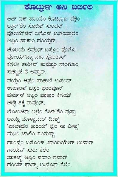 76 ವೀಜ್ ಕ ೊಂಕಣಿ ಪಾವ್ನಸ ಆನಿಧರ್ತಾಆವ್ನಕ ! ಪಾವ್ಸ್ ಧಾಡ್ದೆವಾ,ರೆರ್ತರ್ ರ್ಮಗ್ಣಂ ಆನಿಸ್ಪವಾ ಧರ್ತಾ ರ್ಸಕೊನ್ಸ ನಿದಾಲು ,ರ್ಜೇವಿತಾನೆವ್ಸ್ ಭಾಗಾಲು! ಆಕಾಸಕ್ದೊಳೆರೆೈತಾಚೆ,ದೆಂವಾಲುತ್ ತಾಳೆಕಂಳ್ಬ್ಬು ರ್ಮಡಂಚೆ ನ್ಹಂಯ್ಚಚ ಗ್ಭಾಾ ಫಾತರ್ಉಗ್ತ , ಉಬಿರಂತ್ ರ್ಮಸ್ಪು ಧಡ್ದಡೆ! ವನ್ವಂರ್ತಲಂ ಪ್ಪಲಾಂ ಬಾವಿಲಂ, ರೂಕ್ಝಡಂ ಪಾನ್ವಂನಿಂ ರಿರ್ತಂ! ಮುಗಾಾನಿಂ ಶಹರವಾಟ್ ದಲಿಾ, ಪಂಜಾಿು ಪಾಶಂತ್,ಪೊಟ್ಟು ಬಾಂಯಂನಿ ಸಂಪಡಲಿಂ ಗೊವಾಾಂ ಫಂಡ್ಘಳೊನ್ಸ ಮೆಲಿಂ,ರ್ಮಂಕಾಡಂ ನ್ವಲಾಾ ತೊಟಂಕ್ ತಾನೆಕ್ ರಿಗ್ಲಂ! ಹೊ ಪಾವ್ಸ್ ವೆಳ್ಬ್ರ್ಕಿತಾು ನ್ವ?ಲೇಕ್ ದೆವಾಕ್ಬೊಬಾಟತ! ಥಂಡ್ಯ್ಚಉಪಾಿಂತ್ ಗ್ೇಮ್, ರ್ಮಗ್ರ್ ಪಾವ್ಸ್ , ಲೇಕ್ ದೆವಾಕ್ಲೇಖ್ ಸಂಗಾತ! ಹಂಗಾ ಲೇಖ್ಚುಕ್ಲಲಂ ಕೊಣಂಸಕಾಂ ಪಾಳ್ಬ್ುಂ! ಕಾತಾನ್ಸಾ ರನ್ವಂ,ಉಭಾನ್ಸಾಘರಂ,ಮೊಡಂಕ್ ಅನ್ವರ್ಥ ಕಲಾಂ! ಅಂತರ್ಜಾಳ್ಬ್ಕ್ರ್ಸವಿ ರ್ಮರುನ್ಸ ಚೊವಿೇಸ್ ವೊರಂಯ್ರಗ್ತ್ ಚಂವಾಲಂ! ವಾಹಳೆಚಂ ಉದಾಕ್ರ್ಜರಂವ್ಸ್ ,ವಾಟ್ ನ್ವಸತಂ ರಸತುನ್ಸ ರ್ಮತ್ಂ ಧುಲಾಂ! ಹು ಪಾವಾ್ಕ್ ರಕಚಂ ಸೊಡುನ್ಸ, ಆಮಿಂಚ್ ಆಪವ್ಸ್ ಹಡುಂ! ರೂಕ್ಝಡಂ ಲಾಯಂ,ಪಿಥ್ವವಕ್ಥಂಡ್ಕಯಾಂ. ಲಕಾಕ್ ಜಾಗ್ಿರ್ತಕರುನ್ಸ,ಇರ್ತನ್ಸ ಮಿರ್ತನ್ಸ ಉದಾಕ್ ವಾಪಯಾಂ ನಿಸವಥ್ರಾದೆವಾಚೊ ರ್ಮಗಾಣುಂತ್ ಉಪಾ್ರ್ ಭಾವುಡ್್ , ಹು ಸೊಭಿತ್ ಪಿಥ್ವವಚೊಆಮಿಂಚ್ ಪೊೇಸ್ ಕಯಾಂ! -ಮೆಕಿಿಮ್,ಲರೆಟ್ಟು