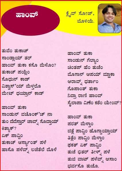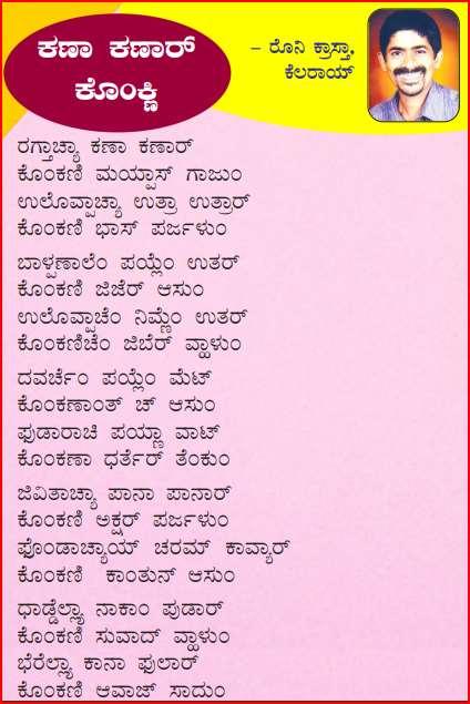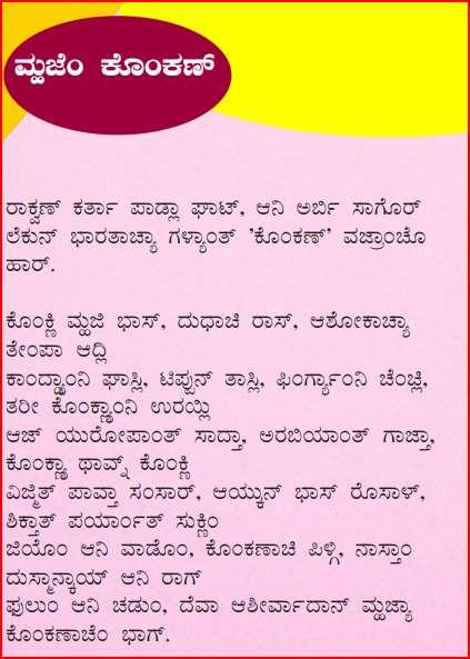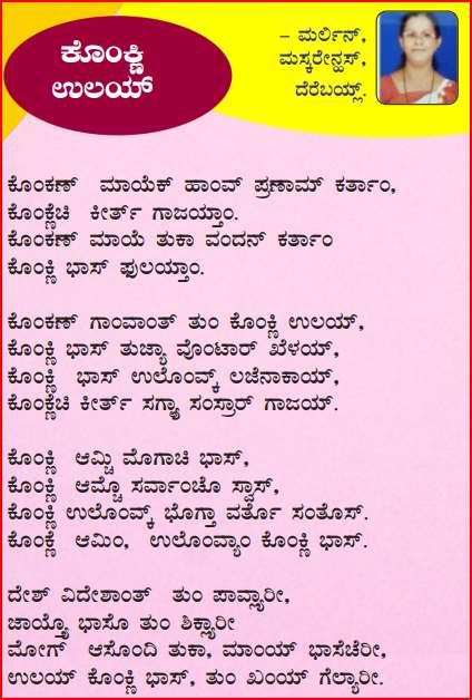 86 ವೀಜ್ ಕ ೊಂಕಣಿ ಎಕಾಚ್ ಉತ್ಲ್ರನ್ ಕಾಂಕ್ಣಿ ಉಲವಾ್ಾನೊ ಸದಾಂ ಕಾಂಕೆಿಚ್ ಜಾವ್ಕ್ ಉರ ಕಾಂಕಾಿಾನೊೇ" ಕಾಂಕ್ಣಿ ಮಾಯ್ ಭಾಶ್ಕ್ ಏಕ್ ಲ್ಯಾಂಬ್ ಚರಿತ್ಲ್ರಚ್ ಆಸಾ. ಲರ್ಾಗ್ ಸಾಡೆ ಪಾಂಚ್ ಹಜಾರ್ ವಸಾಾಾಂಚಿ ಚರಿತ್ಲ್ರ ವಾಚಾಂಕ್ ಮೆಳ್ . ಕಾಂಕ್ಣಿ ಭಾಸ್ ಮಾಲಘಡ್ಾಾಂ ಥಾವ್ಕ್ ದಾಂವ್ಟನ್ಆಯ್ಲಯ ಭಾಸ್.ಪುಣ್ ಸರ್ಬರ್ ಪವೊಾಂ ಕಾಂಕ್ಣಿ ಕಷಾೊಾಂಕ್ ಶಿಕಾಾಲ್ಯಾ . ಸರ್ಬರ್ ಭಾಸಾಾಂ ಸಾಂಗಾಂ ಕಾಂಕ್ಣಿ ಲೊೇಕ್ ಜಿಯೆತ್ಲ್ನಾ, ಹರ್ ಭಾಸಾಾಂ ಥಾವ್ಕ್ಾಂಯ್ೇ ಕಾಂಕ್ಣಿ ಗರೇಸ್್ ಜಾಲ್ಯಾ . ಆಶ್ಾಂ ಹಿ ಭಾಸ್ ಸಾಂಸಾರಚ್ಯಾ ಹರ್ ಭಾಶ್ ಸಾಂಗ ಜಿವಾಳ್ಲ್ ಉಲ್ಯಾಾ. ತ್ಲ್ಾ ಖಾತರ್ ಕವ ಆಶ್ತ್ಲ್, ಮಾಲಘಡ್ಾಾಂನಿ ವಾಾಂಚವ್ಕ್ ಉರಯೆಯಲ ಭಾಸ್ ಆಮಾಂ ಸವಾಾಾಂನಿ ಸಾಾಂಗಾತ್ಲ್ ಮೆಳೊನ್ ಉರಾಂವ್ಕ್ ಜಾಯ್. ಆವಯ್ಾ ಉಸಾ್ಾರ್ ಶಿಕ್'ಲಯ ಭಾಸ್ ಸವ್ಕಾ ಕಾಂಕಾಿಾಾಂಚ್ಯಾ ಜಿಬೆರ್ ಖೆಳೊಾಂದಿ" ಮಹಣ್ಯನ್ "ಆಮ್ ಭಾಸ್ ಕಾಂಕಣಿ" ಪದಾಂತ್ ಗಾವ್ನ್ ಸಾಾಂಗಾಯಾಂ. ಕಾಂಕಣಿ ಭಾಸ್ ಆಟ್ಲಿ ವ್ಟಳ್ತರಿಕ್ ಪವಾ್ನಾ "ಗಡ್ ಪರಸ್ ಚಡ್ಲ ಗಡ್ಲ ಭಾಸ್ ಮಹಜಿ ಕಾಂಕಣಿ" ಮಹಣ್ಯನ್ ವಹಡ್ಲಿಕ್ ಗಾಯ್ನಾ, ಆವಯ್್ ಶಿಕಯ್ಲಯ ಭಾಸ್, ತಚ್ಯಾ ದೂದ ಸಾಾಂಗಾತ್ಲ್ ಕಾಳಜಕ್ ದಾಂವ್ಕ'ಲಯ ಭಾಸ್ ಕಾಂಕಣಿ ಮಹಣ್ ವಣಿಾತ್ಲ್. "ಕಾಂಕ್ಣಿ ಘರಾಂನಿ ಜಲೊಾನ್ ಯೆತ್ಲಾಂ ಮಾಯ್ ಭಾಸ್ ಆಮ್ ಘೊಳೊ ಜಿಬೆರಿ ರಯ್ ಭಾಸ್ ಆಮ್ ಸ್ತ್ಭಾ್ ಸಭೆರಿ ಉಲಯ್ನಾ ಮನಾಾಂ ಭುಲಯ್ " "ಹಳ್ು ಸ್ತ್ಡ್ಯನ್ ಆಜ್ ತ ಡೆಲಯ ಪವಾಯಾ ಆಟ್ಟಿಾ ವ್ಟಳ್ತರಿಾಂತ್ ತ ಮಾನಾನ್ ರವಾಯಾ ತಚ್ ಗಾಂಯಾಂತ್ ರಜ್ ಚಲಯ್ " ಆಶ್ಾಂ ಕಾಂಕೆಿಚಿ ವಹಡ್ಲಿಕ್ ಗಾಜಯ್ . ಆಮಾಂ ಕಾಂಕೆಿಕ್ ಮಾನಾಚೊ ಜಾಗ ಆಮಾಂ ದಿೇಾಂವ್ಕ್ ಜಾಯ್ ಮಹಳ್ು ಆಶಾ ತ್ಲ್ಚಿ. ಪುಣ್ ಆಮ್ ಲೊೇಕ್ ಮಾಯ್ ಭಾಶ್ ವಷಾಾಾಂತ್ ಲರ್ಜತ್ಲ್ತ್ ತ್ಾಂ ಪಳ್ತವ್ಕ್ ದುಖಾಾಂ ರ್ಳಯ್ . "ಆಜ್ ಮಹಜಾ ದೊಳಾಾಂತ್ ದಾಂವ್ಟನ್ ಯೆತ್ಲ್ತ್ ದುಕಾಾಂ ಆಜ್ ಮಹಜ ರ್ಳೊ ಭಾಾಂದುನ್ ಯೆತ್ಲ್ ಆಪಯ ಮಾಾಂಯ್ ಮಹಣ್ಯನ್ ಆಪಾಂವ್ಕ್ ಮಾಾಂಯ್ ತಕಾ ಭೊಗಾ್ ಲಜ್ತಜಾಾ ಥೊಡ್ಾ ಪುತ್ಲ್ಾಂಕ್ ಮಾಾಂಯ್ ಭಾಶ್ ಮಹಜಾ, ಲ್ಯಖಾಂ ಲೊಕಾಾಂಚಿ ಭಾಸ್ ತಾಂ ಮಾಾಂಯ್ ಭಾಶ್ ಮಹಜಾಾ , ಪುಣ್ ತಾಂ ಆಸಾಯ್ ಕನಾಶಾಾಂತ್ ತಾಂ ಜಾ ದಿಗ... ಜಾ ದಿಗ ತಕಾ ದಿ ಜಾಗ...ದಿ ಜಾಗ ತಕಾ" ಏಕ್ ಕಾಳ್ಲ್ ಆಸ್ತ್ಯ . ಆಮಾ್ಾ ಮಾಲಘಡ್ಾಾಂನಿ ಲೊೇಕ್ ಪದಾಂ, ಜಾನ್ಪದ್ರ ಪದಾಂ ಆನಿ ಸಕಾಲಕ್ ಪದಾಂ ಗ್ಳಮಾೊಾಂ ಸಾಂಗಾಂ ಖೆಳೊನ್ ರಕನ್ ವಹಲಯ ಆಸಾ. ಅಸಲಾಂ ಕಾಂಕ್ಣಿ ಪದಾಂ, ಗ್ಳಮಾೊಾಂ, ವ್ಟವಯ್ಲ, ವೇಸ್ಾ ಆಮಾ್ಾ ಕಾಂಕೆಿಚೆಾಂ ವಹತ್ಾಾಂ ದಯ್ಜ . ಹ್ಯಾ ವ್ಟವಯ ವೇಸಾಾಾಂನಿ