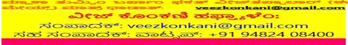 11 ವೀಜ್ ಕ ೊಂಕಣಿ ----------------------------------------------------------------------------------ಮಾನಾದಿಕ್ ಲೊರೆನ್ಸ್ ಸೀಜ್, ಮಾನಾದಿಕ್ ಪ್ಯಾಟ್ರರಕ್ ರೊಡಿರಗರ್ಸ ಹ್ಯಂಚಂ ಮುಕೀಲ್ಾಣಾಕ್ "ವ್ೀಜ್ ಕಂಕಣಿ" ಇ - ಪತ್ರ ಮಾನ್ಸ ಬಾಾಯ್ತಿ . ಹೊಚ್ ಮುಕೀಲ್ಾಣಾಚೊ ವಾಂಟೊ ಖಂದ್ಮಾರುನ್ಸಆತಂಫಾದರ್ ಮುಲ್ಲರ್ಸ್ ಮೆಡಿಕಲ್ ಕಲೀಜ್ ಆಸಾತ್ರ ಹ್ಯಚಂಸಂಕ್ಪಣ್ಹ್ಯತಂ ಘೆವುನ್ಸ ಸವಾ್ಂಕ್ ಎಕಾಟ್ವಂವ್ಚೊ ಮಾನಾದಿಕ್ ರಿಚರ್ಡ್ ಕುವಲೊಲಕ್ ಚಪಂ ಉಕಲ್್ ಮಾನ್ಸ ಕರುಂಕ್ ಫಾವ್ಚ. ಮಾನಾದಿಕ್ ಡೆನಿರ್ಸ ಡೆಸ್ಥ್, ಮಾನಾದಿಕ್ ರುಡೀಲ್ಾ ಡೆಸ್ಥ್, ಮಾನಾದಿಕ್ ಅಜಿತ್ ಮಿನೀಜರ್ಸ, ಮಾನಾದಿಕ್ ಫಾವ್ಚಸ್ಣಿನ್ಸ ಲೊೀಬೊ, ಬಾಪ್ ಜಿೀವನ್ಸ, ಬಾಪ್ ಸ್ಣಲಾಸಟರ್ (ತಂಬೆ), ಬಾಪ್ ರೊೀಶನ್ಸ ಕ್ಪರಸ್ಥ್ಿ , ಬಾಪ್ ಆಶಿಾನ್ಸ ಕ್ಪರಸ್ಥ್ಿ ಸಂಗಂ ಹೆರ್ ದ್ಲಕಿರ್ ಹ್ಯಂಚೊ ವಾವ್ರರ ಹ್ಯತಕ್ ಹ್ಯತ್ ಮೆಳವ್ರ್ ಆಡಳ್ಿಂ ಆನಿ ಜೆಜುಚಂ ಮಿಸ್ಥ್ಂವ್ರ ಚಲ್ವ್ರ್ , ಕ್ಪಯ್ತ್ನ್ಸ ಕನ್ಸ್ ದ್ಲಕಂವ್ಚೊ ವಾವ್ರರ ಕಂಕಿ ಸಮಾಜ್ ಕದಿಂಚ್ ವ್ಸರ್ಚ್ ನಾ. ಅಸಲೊ ಭ್ವ್ಸ ಮ್ಹಜೊ. ಆಜ್ ಫಾದರ್ ಮುಲ್ಲರ್ ಹೊೀಮಿಯೊಪತ ವೈದಕೀಯ್ ಕಲೀಜ್ ಆಪ್ಲಲ ರುಪ್ಯಾಳೊ ಸಂಭ್ರಮ್ ಆಚಸ್ಣ್ತ. ಸವ್ರ್ ವಾಟ್ವಂನಿ, ಕಷ್ಟ - ಸಂಕಷ್ಟಟಚ್ಯಾ ಮೆಟ್ವಂನಿಚಲಾಿನಾಆಮಿಂಸವ್ರ್ ಕರಸ್ಥ್ಿಂವಾಂನಿ ಗವಾ್ನ್ಸ ಆನಿ ಅಭಿಮಾನಾನ್ಸ ಆಮೆೊಂ ಹರ್್ಂ ಬಡವ್ರ್ ಸ್ಥ್ಂಗ್ಯಾತ್... "ಫಾದರ್ ಮುಲ್ಲರ್ಸ್ ವೈದಾಕೀಯ್ ಕಲೀಜ್ಆನಿ ಆಸಾತ್ರ ಆಮಿೊ ..." ಸವ್ರ್ ವ್ೀಜ್ ಕಂಕಣಿ ಪತರಚ್ಯಾ ವಾರ್ಚಾ ಆನಿ ಅಭಿಮಾನಿ ತಪ್ನ್ಸ ಆಮಿಂ ಉಲಾಲರ್ಸ ಪ್ಯಟಯ್ತಿಂವ್ರ. ಸವ್ರ್ ಯಶಸ್ಣಾ ಫುಡೆಂಯೀ ಆಶತಂವ್ರ. ಸಂಪ್ಯದಕ್ ದೊ. ಆಸ್ಣಟನ್ಸ ಡಿಸೀಜಾ ಫ್ರಭು ಆನಿ ಸಹ ಸಂಪ್ಯದಕ್ ಪಂಚು, ಬಂಟ್ವಾಳ್. (ಬಪ್ಯ್ ಸ್ಥ್ಹೆತಕ್ ಸಹಕ್ಪರ್ ದಿಲಾಲಾ ಮ್ಹಜಾಾ ಮಾಳ್ ಯ್ತಜಕ್ಪಂಕ್ ದೀವ್ರಬರೆಂಕರುಂ!! -----------------------------------------