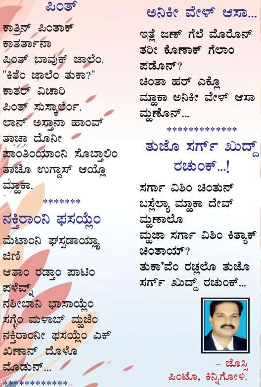52 ವೀಜ್ ಕ ೊಂಕಣಿ ವಚುನ್ ಮಾಹರ್ಕ ಸಭಾರ್ ಬರ ಬರ ಸೈರಕಾ ಆಯಿಲ್ವಯಾ. ಆವಯ್-ಬಾಪ್ಯ್ ಉಪಾ್ಿಂತ್ಲ್ ಫಿ್ಾದ್ ಜ್ವಡ್ತ್ಯಾ ಪದ್ಲರ್್ಮದ್ಲರಚಿಂ ರ್ಕಮ್ ಖಿಂಯ್, ತಾಿಂಚ್ಯ ಫಿ್ಾದ್ಲ್ಚಿ ಜತನ್ ಘೆಿಂವ್ನಿ. ಪುಣ್ ಹೆಿಂ ಕಣ್ ಕರಾ ? ಹ್ಯಿಂವ್ಿಂ ಖರಿಂಸಿಂಗೆ್ಿಂತರ್, ಹ್ಯಿಂವ್ಿಂಮಹಜಾ ಪದ್ಲರ್್ -ಮದ್ಲರ ಕ್ ಆಜೂನ್ ಪ್ಳಿಂವ್ನಿಿಂಚ್ಚನಾ. ವಹಯ್, ದವನ್ ಮಾಹರ್ಕ ರನ್ು ಮಹಜ್ವ ಗ್ಲಡ್ತ ಫಾದರ್ (ಪದ್ಲರ್್ ) ಕರುನ್ ಸಜಾರಾಾಿಂಗೆರ್, ರ್ಕಜಾರಾಕ್ ಹ್ಯಜರ್ ಜಾಿಂವ್ಾ ನಬಾನ್ ಧಾಡ್ತಲ್ವಯ! ಮಹಜೆಿಂ ನಸಿಳಪಣ್ ಲುಟ್ಟನ್ ತಾಣ ಘಡಾಚಿಂ ಸ್ತುಃಖ್ಯ ಜ್ವಡಾತ್ಲ್ ಆಸ್ಲ್ಯಿಂ; ಪುಣ್ ಮಾಹರ್ಕ ರಾಕನ್, ಬರ ಬೂದ್ಬಾಳ್ ಸಿಂಗ್ಲನ್, ಬರಾ ಜಿವ್ಟತಾಕ್ ಪಾವಯಿಲ್ವಯ , ಮಹಜ್ವ ತೊ ಗ್ಲಡ್ತ ಫಾದರ್ಜಾಲ್ವಯ!!! ಭುಾಾ್ಂಲಂವ್ೀಜ್ ಖಾಲೆತೊ ಜಾಲೆತೊ ವ್ಹರೆತೊ ಜಾತಾ -ಜೆ.ಎಫ್.ಡಿ'ಸೀಜಾ, ಅತಿವರ್. ಫಾ್ನ್ು ದಶಾಚೊರಾಯ್ಹೆನ್ ಚೊವ್ ಏಕ್ ಲ್ವರ್ಕಮಗಾಳ್ ವ್ಕಿ್ ಜಾವ್ಸ್ಲ್ವಯ .ಆಪುಣ್ಏಕ್ರಾಯ್, ಪ್ರ ವಹರ ವಹಡ್ತ ಮಹಳುಿಂ ಭೊಗಾಪ್ ತಾಚಥಿಂಯ್ ನಾತ್ಲ್ಲ್ಯಿಂ. ರಾಯ್ ಮಹಣ್ಹಿಂರ್ಕರ್ಸಯ್್ ತಾಚಥಿಂಯ್