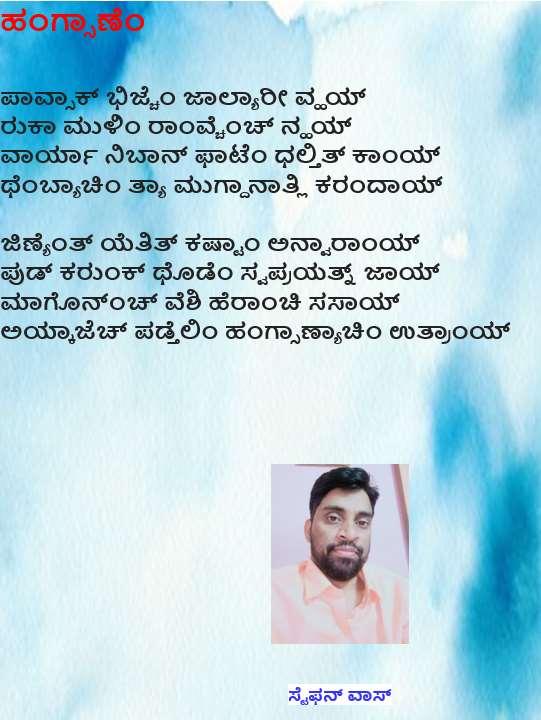 51 ವೀಜ್ ಕ ೊಂಕಣಿ ವ್ಟಿಂಚಿನಾ....” ಹ್ಯಿಂವ್ಿಂ ತಾಾ ರ್ಕಗಾಿಿಂಕ್ ಆನ ತಸ್ತವೋರಾಿಂಕ್ ಪ್ಳವ್ನ್ ತಾಿಂತಾಯಾ ಎರ್ಕ ಸಧೊ ದಿಸ್ಾ ಚ್ಾಕ್ ವ್ಟಿಂಚುನ್, “ಹ್ಯರ್ಕ ಹ್ಯಿಂವ್ನ ಜಾಪ್ ಧಾಡಾ್ಿಂ ಮಾಿಂಯ್...” ಮಹಣೊನ್ ತಿ ತಸ್ತವೋರ್ಮಾಿಂಯ್ಿ ದ್ಲ್ಕೆೈಲಿ. ಉಪಾ್ಿಂತ್ಲ್ದವಕ್ಅಗಾಾಿಂದಿೋವ್ನ್ , ಬಾಕಿಚ್ಯಿಂಕ್ ಸಮಾಧಾನ್ ಕರುನ್ ಜಾಪ್ ಬರವ್ನ್ ಹ್ಯಿಂವ್ಿಂ ತಿಿಂ ರ್ಕಗಾಿಿಂ ಸಿಂಗಾತಾಚ್ಚಪಸ್ಿ ಕೆಲಿಿಂ. ಹ್ಯಿಂವ್ಿಂ ವ್ಟಿಂಚ್ಚಲ್ವಯ ಚಲ್ವ ಮಹಿನಾಾ ಭಿತರ್ ಮಹಜಾ ಗಾಿಂವ್ಾ ವ್ಟಳ್ಯಸಚರ್ ಹ್ಯಜರ್ ಜಾಲ್ವ! ಎರ್ಕಮೆರ್ಕ ಆಮಿ ಪ್ಸಿಂದ್ ಕರುನ್ ರ್ಕಜಾರಾಚಿತಾರೋಕ್ಫಿಕ್ು ಕೆಲಿ. ಮಹಜಾ ನವ್ಾನ್ ರ್ಕಜಾರ್ ಗಾಿಂವಿಂತ್ಲ್ಚ್ಚ ಜಾಿಂವ್್ಿಂ ಮನ್ ದ್ಲ್ಖಯೆಯಿಂ! ಸಗಾುಾ ಹಳುಕ್ಚ್ಚ ರ್ಕಜಾರಾಕ್ ಆಪ್ವ್ನ್ , ರಾಯಾನ್ ರ್ಕಜಾರ್ ಜಾಿಂವ್್ಪ್ರಿಂ ಮಾಹರ್ಕ ಬಾಿಂಗಾರಾನ್ ನಟವ್ನ್ , ಉದ್ಲ್ಿಪ್ರಿಂ ಪ್ಯೆಾ ಖರ್್ ಕರುನ್ ಮಾಹರ್ಕ ತಾಚಿ ಹರ್ಕಲ್ಕರುನ್ತಾಣಘೆತಯಿಂ!!! ಹೆಿಂ ಪ್ಳಯಿಲ್ವಯ ಲ್ವೋಕ್ ಮಾತ್ಲ್್ ಪಾತಾನಾ ಜಾಲ್ವ. ಮಾಹರ್ಕ ನಾರ್ಕ ಜಾ್ಯಾ ಉತಾ್ಿಂನ ಖೆಿಂಡ್ತಲಿಯಿಂ ಸಜಾರ್ಿಂ ಮಾತ್ಲ್್ ಪ್ಳಯಿತ್ಲ್್ ರಾವ್ನಲಿಯಿಂ!! ತಾಿಂಚರ್ ರಾಗ್ ಕರನಾಸ್ಿಂ, ಹ್ಯಿಂವ್ಿಂ ಸರ್ಕುಿಂ ಪಾ್ಸ್ ಚಡ್ತ ಮಾನ್ ಆನ ಮೋಗ್ ಪ್ಯೊಯ ತಾಿಂರ್ಕಿಂಚ್ಚ ದಿಲ್ವ. ತಿಂ ಪ್ಳವ್ನ್ ತಾಿಂಚ್ಯ ಸರಾವಿಂಚ್ಯ ದ್ಲಳ್ಯಾಿಂನ ದುುಃಖ್ಯಿಂಆಸ್ಲಿಯಿಂ. ಪ್ಳತಾನಾ ಹ್ಯಿಂವ್ಿಂ ರ್ಕಜಾರ್ ಜಾಲ್ವಯ ಚಲ್ವ-ಗೆ್ೋಶನ್, ಬೊೋವ್ನ ವಹಡಾ ಕುಟ್ರಿಿಂತೊಯ ಜಾವ್ಸನ್, ಆಸ್ತಿರಯಾ ದೋಶಾಿಂತ್ಲ್ ಆಪೆಯಿಂ ಸವಿಂತ್ಲ್ ಬೊೋವ್ನ ವಹಡ್ತ ಬಿಸ್ಸ್ ಕರುನ್ ಆಸ ಮಹಣ್ ಕಳುಿಂ, ಜೆಿಂ ತಾಣ ತಾಚ್ಯ ಧಾಡ್ತ್ಯಾ ರ್ಕಗಾಿರ್ಕಿತಿಂಚ್ಚಬರಿಂವ್ನಿ ನಾತ್ಲ್ಲ್ಯಿಂ. ರ್ಕಜಾರ್ ಜಾವ್ನ್ ತೊ ಮಾಹರ್ಕ ಆಪಾಣಸಿಂಗ್ಲಿಂಬೊಿಂಬೆೈವಹರುನ್ಗೆಲ್ವ. ಥಿಂಯುರ್ ಕೂಡಯ ಮಹಜ್ವ ಪಾಸ್ ಪಟ್ಾ ಕರವ್ನ್ ಥೊಡಾಾಚ್ಚ ದಿಸಿಂ ಭಿತರ್ ಗೆ್ೋಶನಾನ್ ಮಾಹರ್ಕ ಆಪಾಣಸಿಂಗ್ಲಿಂ ಆಸ್ತಿರಯಾ ಆವಪ್್ ವ್ಹಲ್ಿಂ. ಆಸ್ತಿರಯಾಿಂತ್ಲ್ ಗೆ್ೋಶನಾಚೊ ಬೊಿಂಗ್ಲಯ , ಚ್ಯರ್ಕ್ಿಂ ಆನ ರ್ಕರಾಿಂ ಪ್ಳವ್ನ್ ಹ್ಯಿಂವ್ನ ಮಾತ್ಲ್್ ಹೆಾ ಜಿಣಾಿಂತಯ ಮಹಜೆಿಂ ಸವಪಾಣ್ಗಾಯ್ ಮಹಣ್ ಚಿಿಂತುಿಂಕ್ ಪ್ಡ್ತಲಿಯಿಂ. ದವಕ್ ಅರಾುಿಂ ದಿೋಿಂವ್ನಿ ಹ್ಯಿಂವ್ನ ವ್ಟಸ್ಲಿಿಂ ನಾ. ದವಚ್ಯದಣಾಾಿಂತ್ಲ್ವ್ೋಳ್ಆಸಪುಣ್ ರ್ಕಳೊಕ್ ನಾ ತಿಂ ಮಾಹರ್ಕ ಕಳ್ಲ್ಯಿಂ. ಮಹಜೆ ತಸ್ಾ ಪಾಪ್, ಗರೋಬ್ ಆನ ಹಳುಿಂತಯಾ ಚಲ್ಾಕ್ ಎದ್ಲ್ಾ ವಹಡಾಯಾ ಘರಾಣಾಾಿಂತಿಯ , ಗೆ್ೋಸ್್ ಸೈರಕ್ಮೆಳ್ವಿಂಕ್ ಸದ್ಯ್ಗಾಯ್? ಕಿತಾಾಕ್ ನಜ್ವ, ದವಚೊ ಹ್ಯತ್ಲ್ ತಾಚ್ಯ ಮಾತಾಾರ್ ಆಸಯಾರ್? ಆತಾಿಂ ಮಾಹರ್ಕ ರನಾುಚೊ ಉಗಾುಸ್ಆಯಾಯಾ ಶವಯ್ರಾವಯನಾ. ವಹಯ್ ಹೆಿಂ ಸವ್ನಾ ಜಾಲ್ಯಿಂ ರನಾು ಥಾವ್ನ್ಿಂಚ್ಚ! ರನಾುನ್ ಮಹಜೆ ಕಡನ್ ವ್ಟಚ್ಯರುನ್ ವ್ಹಲಿಯ ತಸ್ತವೋರ್, ಮಹಜಾ ಬರಾ ಗುಣಾಿಂಆನತಪಿಾೋಲ್ವ್ಟವರಾಿಂ ಸಿಂಗ್ಲಿಂಅಿಂತರಾಳ್ಯರ್ಘಾಲಿಯ ಆನತಿಂ