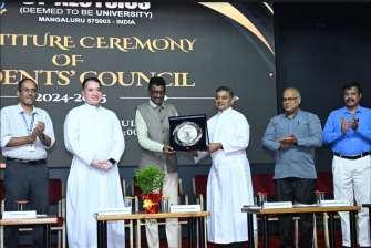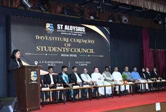 The Investiture Ceremony of the Students’ Council 2024-25 of St Aloysius (Deemed tobe University), Mangaluru was held on 18th July 2024 in the L F Rasquinha Hall of LCRI Block. Prof. (Dr) P. L. Dharma, Vice Chancellor of Mangalore University, Mangaluru, wasthechief guest. Rev. Fr Melwin Joseph Pinto SJ,Rectorof StAloysius Institutions presided over the programme. Rev. Dr Praveen Martis SJ, Vice Chancellor; DrAlwynD’Sa,Registrar of the College; DrRonaldNazareth, Registrar of the University, DrAnup