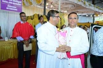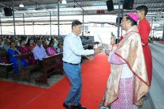 Rev Fr Andrew Leo D'Souza, Parish Priest of St Lawrence shrine, felicitated the Bishop with a beautifulshawl,flowerbouquetand a memento, extended his heartfelt thanks to Rev. Msgr. Duming Dias BishopofKarwar&allthepriestsfor