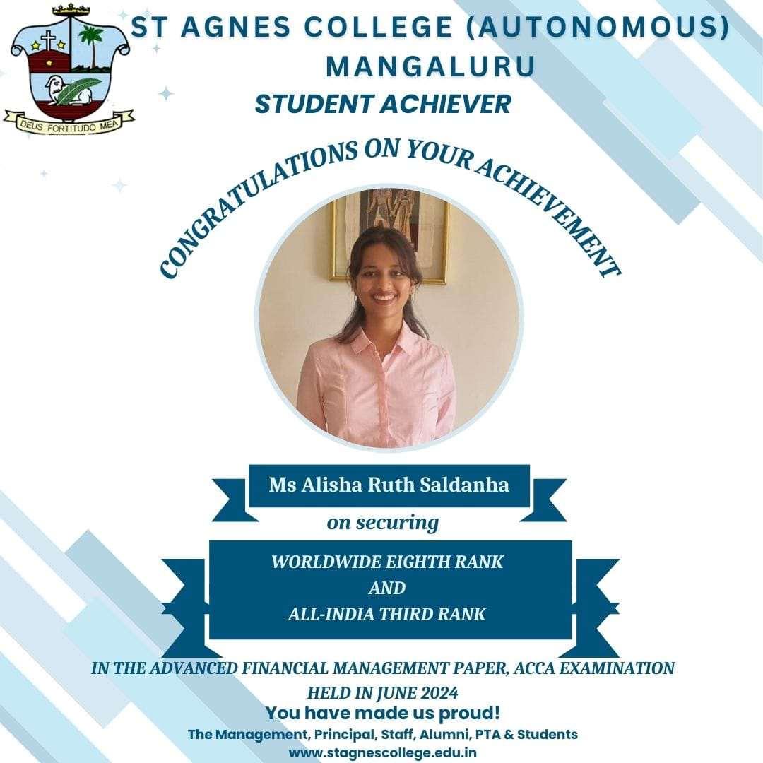 MsAlishaRuthSaldanha,analumna of St Agnes College (Autonomous),has secured the AllIndia 3rd Rank (AIR) and the 8thglobal rank in the Advanced Financial Management paper of ACCAduringtheJune2024session.