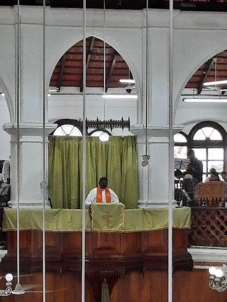 TheKannadaservicebeganat8a.m. in the CSI Shanti Cathedral, Balmatta. The Church was decorated with coconut fronds which is a local cultural feature. The decoration was apt and not over