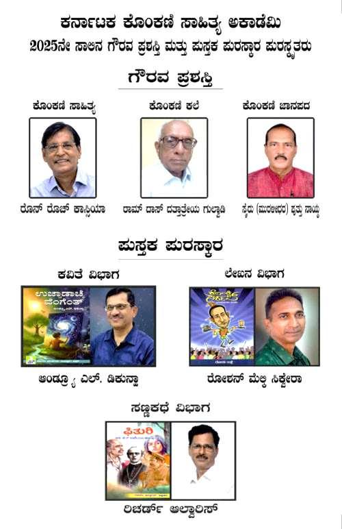 The2025HonourAwardshavebeen announced forRon Roche Cassia in the Konkani Literature category, Ramdas Dattatreya Gulwadi in the Konkani Art category, and Sairu (Muralidhar) Puttu Naik in the Konkani Folklore category.