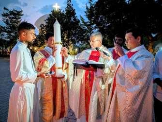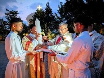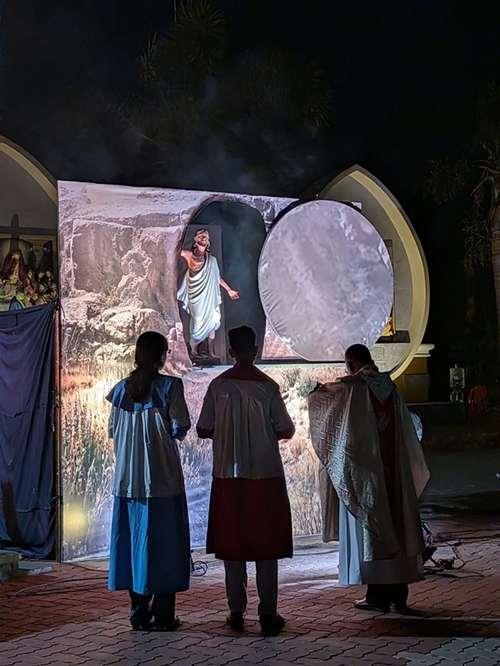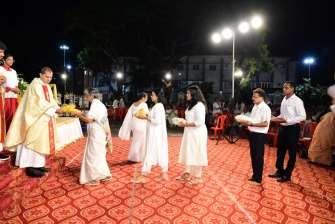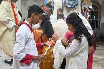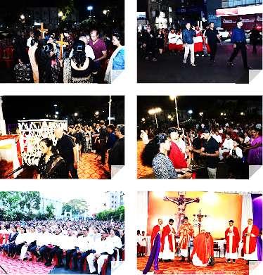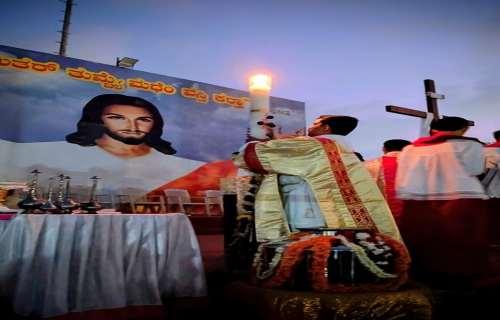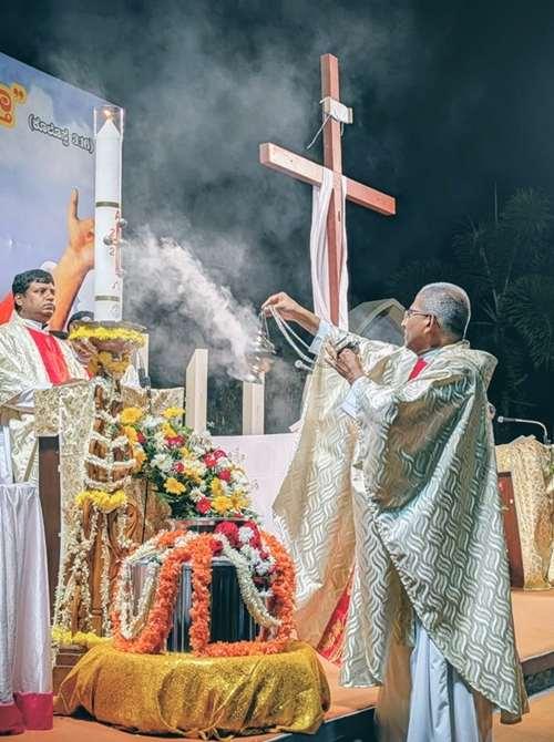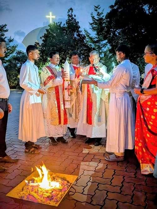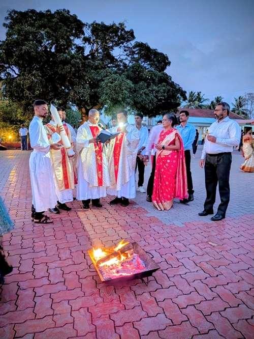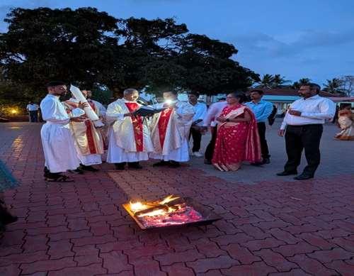 solemnizedthepaschalhymnandfr Gerald pinto conducted the service of fire and water blessing. Fr Avith Pais and Fr Jason Pinto concelebrated. The volunteers guided the service. Many people participated in the service singing Alleluia, Christ is Risen and He has attainedvictory oversinanddeath.