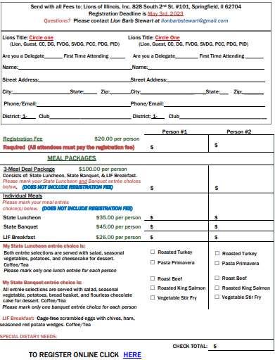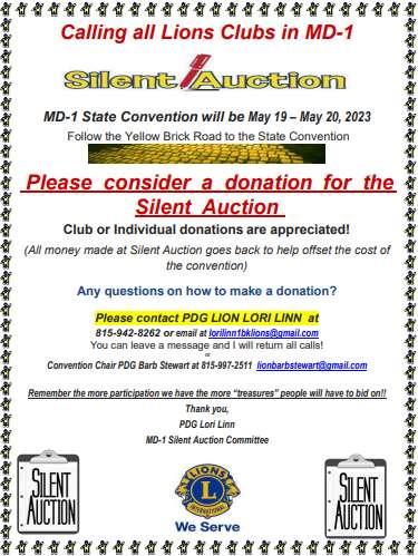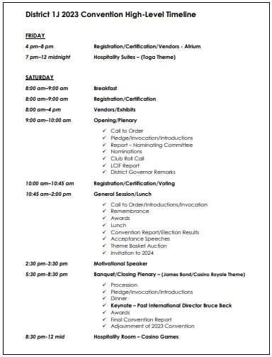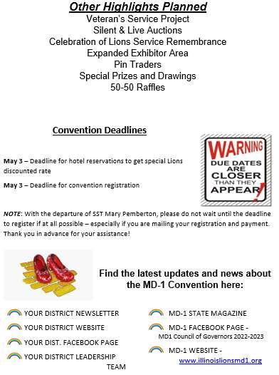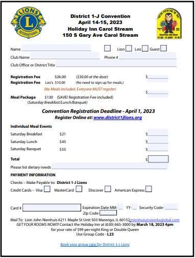 • Registration - The high level timeline and paper form are attached. You can also go to the District 1J website and register online. (district1jlions.org) All attendees must be registered, including those only attending Friday night. We have some fun times planned for all, and hope you join us to celebrate everyone's accomplishments this year. Deadline for convention registration with meals is Saturday, April 1st. (DGs, 1VDGs and 2VDGs should have received an email from your counterpart in 1J with this information and a special discount code.)