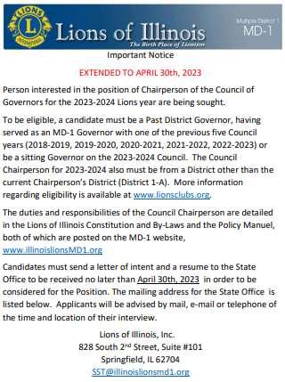 The 2022-2023 MD-1 Council of Governors is now accepting applications for a Secretary/ Treasurer (SST) for the Lions of Illinois, Inc. This is an Administrative Assistant/ Bookkeeper position for the MD-1 Council of Governors who are members of Lions Club International. The position is a part time position for approximately 24- 32 hours/ week. The actual work schedule will be established by the successful applicant and the Council of Governors. The State Office is located at 828 South 2nd Street, Suite 101, in Springfield, IL 62704. The position will occasionally require work on evenings, weekends (estimated to be between 4 and 6 times a year), and some overnight stays. Salary is commensurate with qualifications and experience.