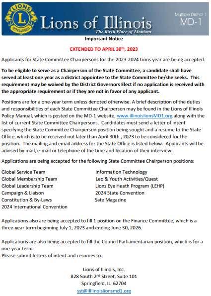 Lions of Illinois, Inc. State Secretary/Treasurer Position Applicants Needed