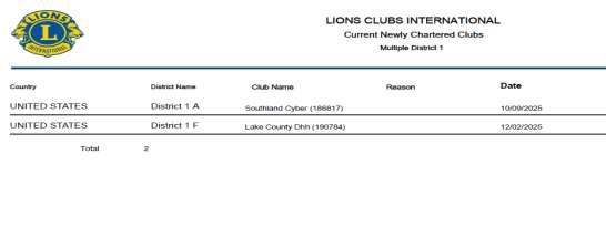 District 1A chartered a new club on 10/09/25 with 21 members. District 1 F chartered a new club on 12/02/25 with 27 members.