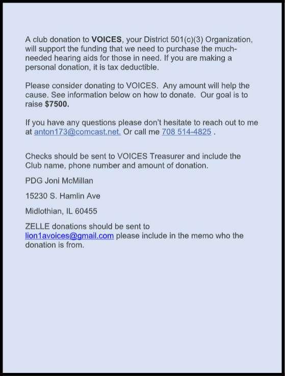 Hello, District 1-A Lions, Greetings from the VOICES team, the Charitable Arm of District 1-A.