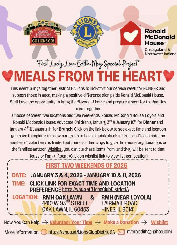 Now that we got the tough love out of the way, let’s talk about are amazing service that hadgone on in January. The month of January found us in another set of Weeks of Service that was so amazing. January Weeks of Service focused on Hunger. First Lady Lion Edith had a special service project for our district to join not just to cover requirements for a Club Excellence Award, but to bring together clubs and give them the opportunity to meet one another while serving. As you all know, Ifirmly talkabout how important it is that we have relationships with each other no matter what clubwe come from and this project certainly helped with that. Her project was called Meals from the Heart and we had many clubs through our entire district participate in cooking meals for families that were staying at the Ronald McDonald Houses at the Advocate Christ Hospital and the Hines, Loyola locations. We both split our time between both locations, andI’lltellyou thatseeing our clubs come together for a
