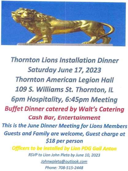This was a busy month. On May 6 the district had their Kentucky Derby Party, everyone had a great time. Thank you to the committee for their hard work. On May7IattendedtheThornton’sand Stickney-Forest View Pancake Breakfast, as usual they were both delicious. On May 10 Lion Bonnie and I attended Glenwood’s Anniversary Party. We enjoyed ourselves and the venue was great. The next evening we attended Oak Lawn’s Law and Order Night. This is always a great evening where they honor one Police Officer and one Firefighter. Their families and their workfamiliesalsoattend.Itisa very special night for them. On May 12 we attended my clubs Officer Installation Dinner. That is always fun to see their families and spend
