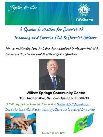 On behalf of current District Governor Tony Zartler, and incoming District Governor Tom Elsey you're invited to come with your club leadership team to hear from our International President Brian Sheehan on Monday June 5th at 6pm. Light dinner and refreshments will be served. All the details are found on the attached invitation.