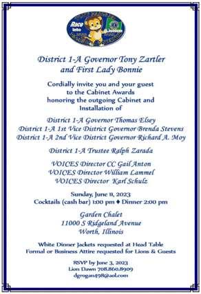 endeavor.Iwouldliketothankallof the PDG’s for their assistance and guidance. I would like to thank my Cabinet members for their dedication to their positions and to the Lions they served. You were greattoworkwith.Thankyoutothe Worth Lions Club who stood beside me for the last 3 years, helping me all the way. Lastly I would like to