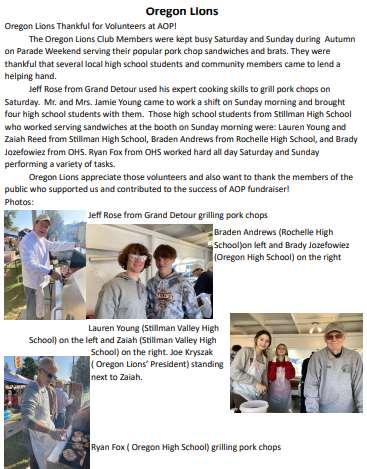 TheLeafRiverLionswillbehonoring Veterans on Saturday November 12 withasDriveThruBratandHotDog lunch. Veterans eat free. Proceeds from the event will be donated to the Veterans Drop-in Center in Rockford. The Center provides a gathering place for homeless veteransandfeedsthemanoonand evening meals. Veterans can also get clothing and other personal