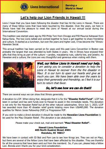 I am asking each district if they would send out the Appeal Letter that is attached. This appeal gives the Lions, clubs, and the district ways that they can help our fellow Lions in Hawaii. We have had a close relationship with Lions that are from Maui and now they can use our help.